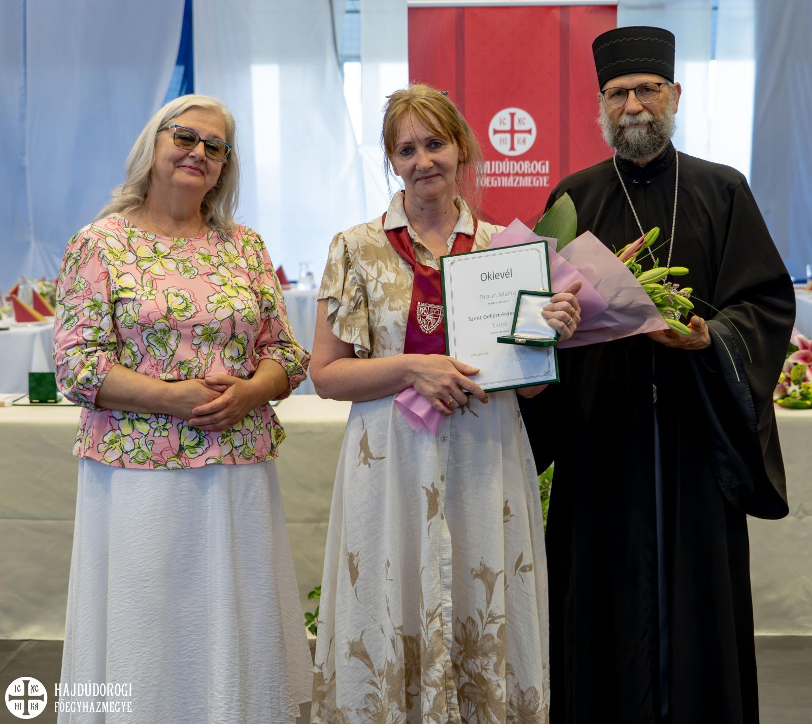 A Szent Gellért díj Ezüst fokozatát vette át Czentyéné Kerti Judit, a nyíracsádi Szent Piroska Görögkatolikus Két Tanítási Nyelvű Általános Iskola tanítója. Hivatását valódi küldetésként éli meg, tanítóként mindig szem előtt tartja a legfontosabbat: a gyermek személyiségének tiszteletét, fejlődésének támogatását és a közösség erejét. Munkáját a szakmai igényesség, a nyitottság és a folyamatos megújulás jellemzi.