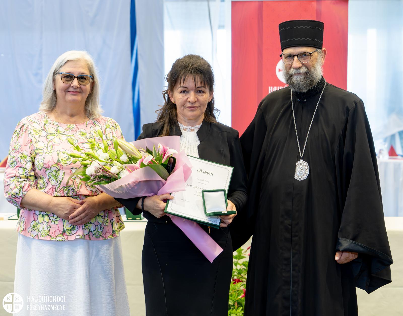 Elismerő oklevelet vett át Kiss Zoltánné, a debreceni Szent Efrém Görögkatolikus Óvoda, Általános Iskola technikai munkatársa, aki feladatait mindig csendes alázattal, mégis a legnagyobb odaadással és szorgalommal végezte. Kezei nyomán az intézmény termei, folyosói nap mint nap olyan környezetté váltak, ahol a gyermekek egészséges és biztonságos légkörben tanulhattak, játszhattak, és ahol mindenki otthon érezhette magát.