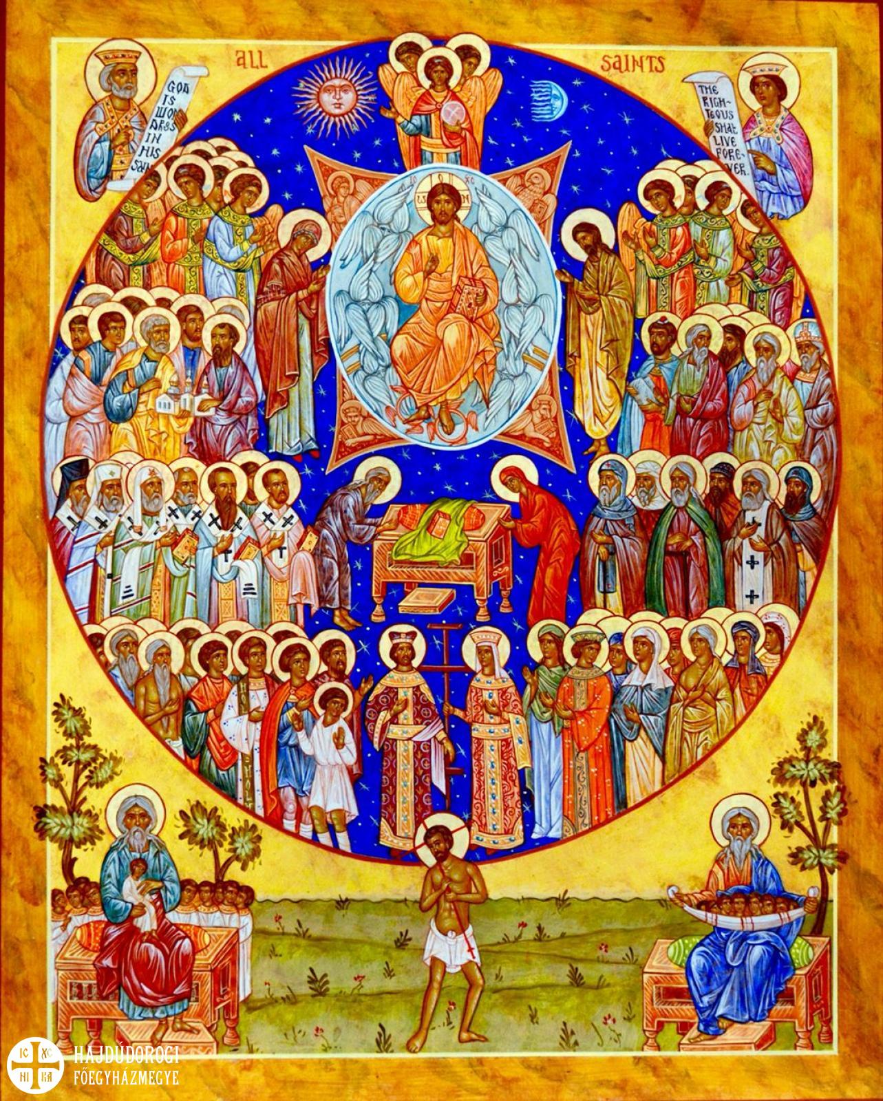 Egyházi naptárunk az év minden napját egy vagy több szentnek, vagy szentek csoportjának szenteli. Nagyon sok szent van a mennyben, akiknek a neve nem található az egyházi naptárban, és akik nem ismertek a világ előtt, jóllehet az élet könyvébe örökre be vannak jegyezve. Ezért kívánsága az Egyháznak, hogy illő tisztelettel adózzon a mennyben élő ismert és ismeretlen szenteknek. Az így tisztelt szentek első csoportja a szent vértanúké volt. Aranyszájú Szent János (+407) idejében a Görög Egyházban még tartották az összes vértanú ünnepét. Meglévő hagyaték a tiszteletükre a pünkösd utáni vasárnapon mondott dicsőítő beszéde. „Még nem telt el hét nap – mondja – azóta, hogy Pünkösd szent ünnepét tartottuk, és elérkezett hozzánk a vértanúk kara, a hit katonái és serege, akik nem hódolnak a Jákob által látott angyalok serege előtt, hanem ugyanolyan lelkesek és egyenrangúak velük.”