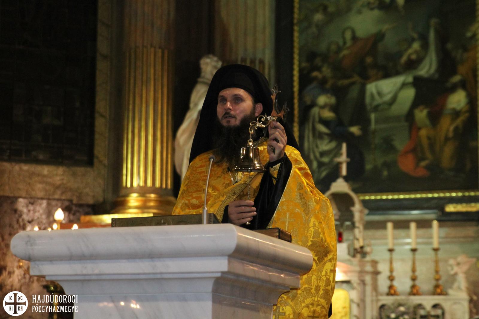 Szocska Ábel atya a szentekről beszélt. Mi emberek ugyanis sokszor fordulunk hozzájuk, hogy kérjük az ő segítségüket, közbenjárásukat. Emellett van egy olyan képességük, hogy különleges kapcsolatot tudtak ápolni a jó Istennel. Szent László is nem csak azon fáradozott, hogy szent legyen, hanem hogy másokat is Isten elé vezessen. Jó példája ennek a mi zarándoklatunk is, hiszen most minket is ő vezetett ide. A szent eszközöknek pedig megvan az a képességük, hogy megszólítják az embert, Istenhez hívnak és vezetnek minket. Ennek kapcsán mondta el, hogy hozott magával valamit. Érsek atyának tartozott egy dologgal, amit most szeretne pótolni. Rábízott ugyanis korábban valamit: egy kis harangot, hogy készíttessen hozzá egy foglalatot. Amikor a Metropólia Hivatalát megáldották, akkor szerette volna átadni ezt az ajándékot, de most hozta magával. A hivatali székházban, ahogyan a mai estén Szent László hívott bennünket, úgy a harangszó is hívni fogja majd az ott dolgozókat, hogy ők is közeledjenek Istenhez – majd a Mária Rádió hallgatóira is gondolván, megkongatta a harangot. Végezetül azt mondta: "kívánom, hogy egész katolikus egyházunknak adjon a jó Isten nagyon sok szentet, akik ezreket vezetnek majd az Isten színe elé."