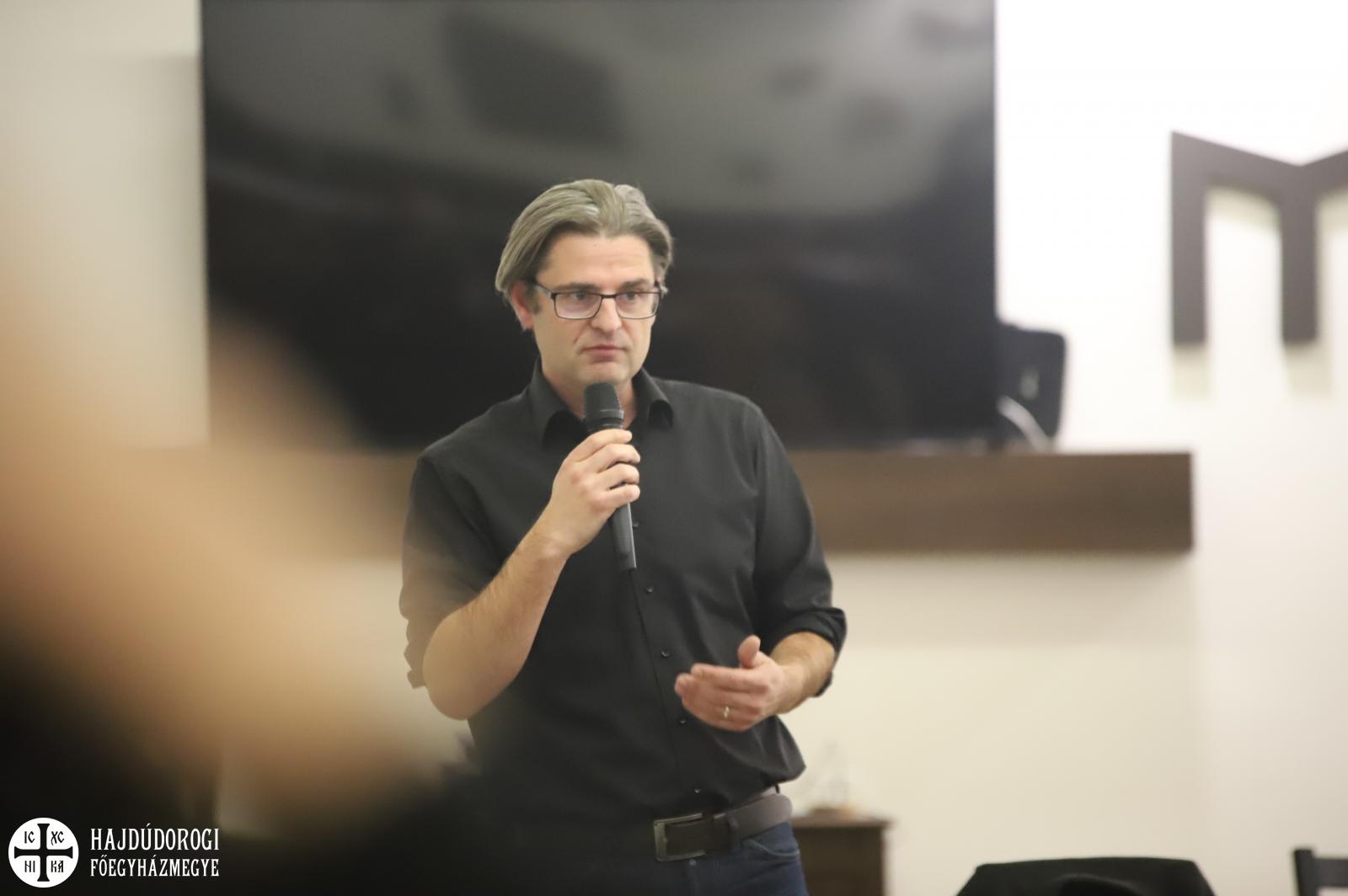 Ezek után szólította meg a forró teáját, kávéját, finom süteményét fogyasztó hallgatóságot Gyurkovics Miklós atya, a Szent Atanáz Görögkatolikus Hittudományi Főiskola rektor-helyettese, aki a karácsonyi üdvözlőlapok főbb üzeneteit, mint család, boldogság, gazdagság a Jóisten irányából közelítette meg.