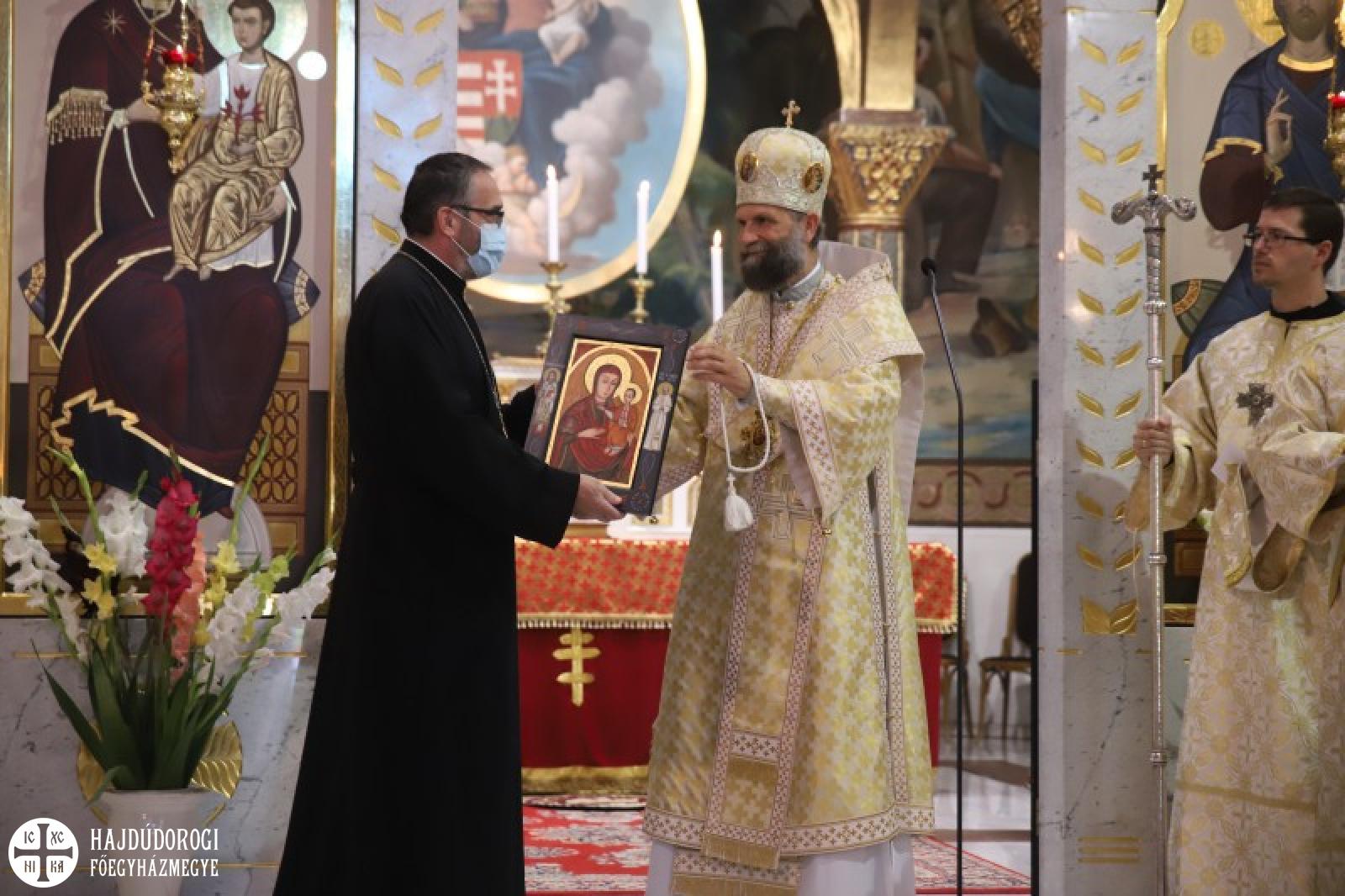 A Szent Liturgián nem feledkeztek meg arról sem, hogy Laczkó Zsolt kórházlelkészünk pappá szentelésének évfordulója volt. Ebből az alkalomból Fülöp metropolita atya felhatalmazást adott neki a papi mellkereszt viselésére, illetve egy gyönyörű ikont is ajándékozott Zsolt atyának. Az ikonon a pócsiIstenszülő mellett két kortárs szent is látható: Szent II. János Pál pápa és Szent Nektáriosz, a daganatos betegségek gyógyítója. A szertartást az ilyenkor szokásos gyümölcsáldás és miroválás zárta.