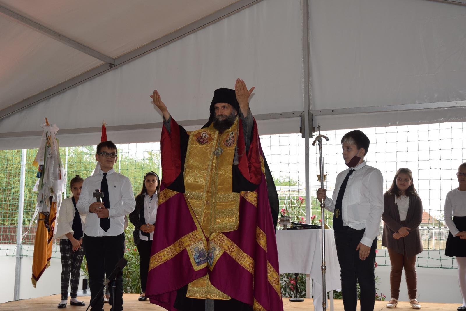 Az ünnepség elején Kocsis Fülöp érsek-metropolita felszentelte a pályát, majd az eső elől biztonságot nyújtó sátor alatt végzett szentelő szertartást, ahol Tatai Zoltán iskolalelkész liturgikus énekkara is részt vett.