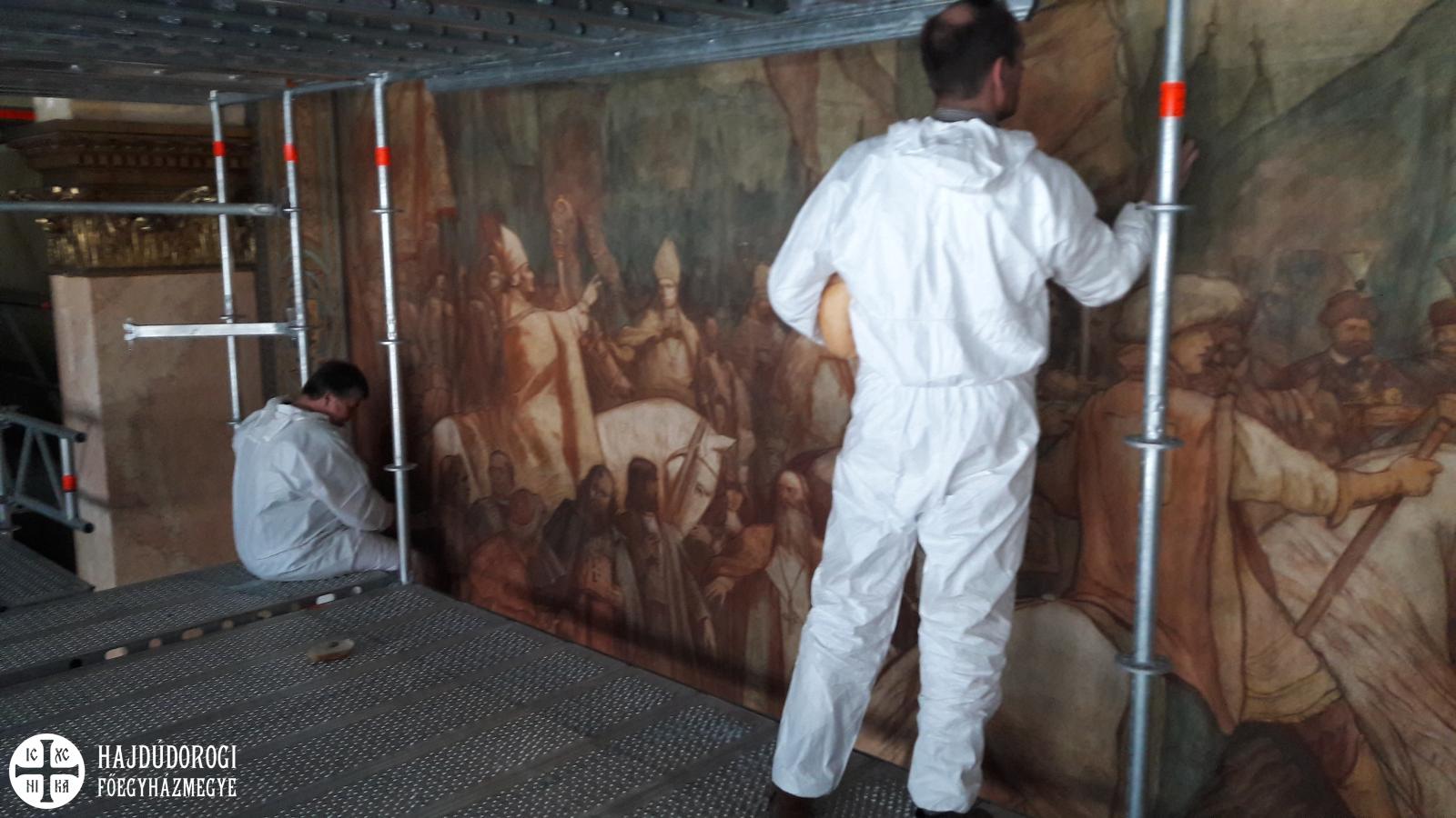 - Most a műteremben van a kép, Budafokon. Éppen most csinálom azokat a fázisokat, hogy a hátoldalt konzerváltam, és teszem bele ezt a kicsit rugalmasabb festékbe a gézt, ha ez megszárad, akkor talán a héten már lemoshatom róla azt az enyvet, amit december végén fölkentünk az első rétegekben. Ha ez sikeresen megtörténik, akkor boldogság van! Ugyanoda viszont nem tud visszakerülni ez a kép, mert ott ugye az ’50-es években a szentélyben található ablakokat befalazták és erre a vakolatra került fel ez a kép. Azért is kellett most levenni, mert az ablakokat újra meg akarták nyitni. Ha jól tudom, ki lesz állítva valahol.