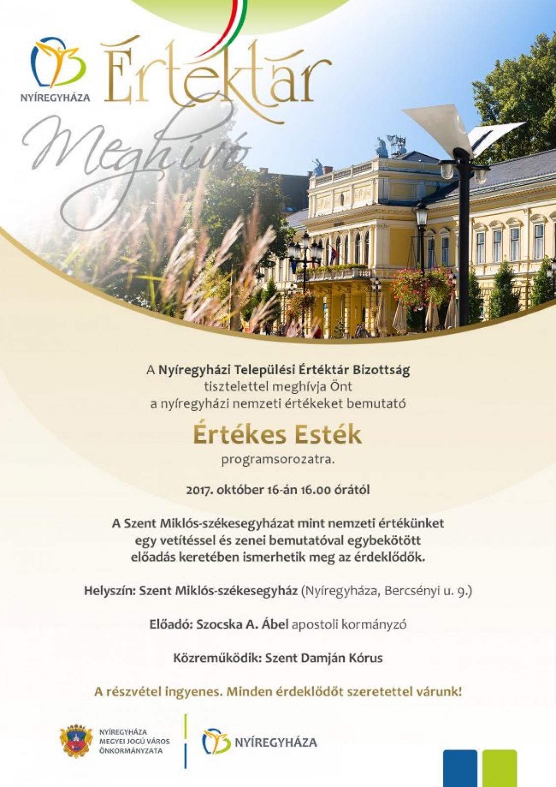 A nyíregyházi Szent Miklós-székesegyház nemzeti értékké vált, bekerült a Nyíregyházi Települési Értéktárba. A százhúsz éve szentelt görögkatolikus templom bemutatása 2017. október 16-án 16 órától kezdődik. A görögkatolikus székesegyház 120 éves történetre tekint vissza, 1897. október 10-én Firczák Gyula munkácsi püspök szentelte fel. Szeretettel várnak minden kedves érdeklődőt – az Értékes Esték programsorozat részeként – 2017. október 16-án 16 órától a bemutatkozó előadásra, melyet Szocska A. Ábel apostoli kormányzó tart. Közreműködik a Szent Damján Kórus.