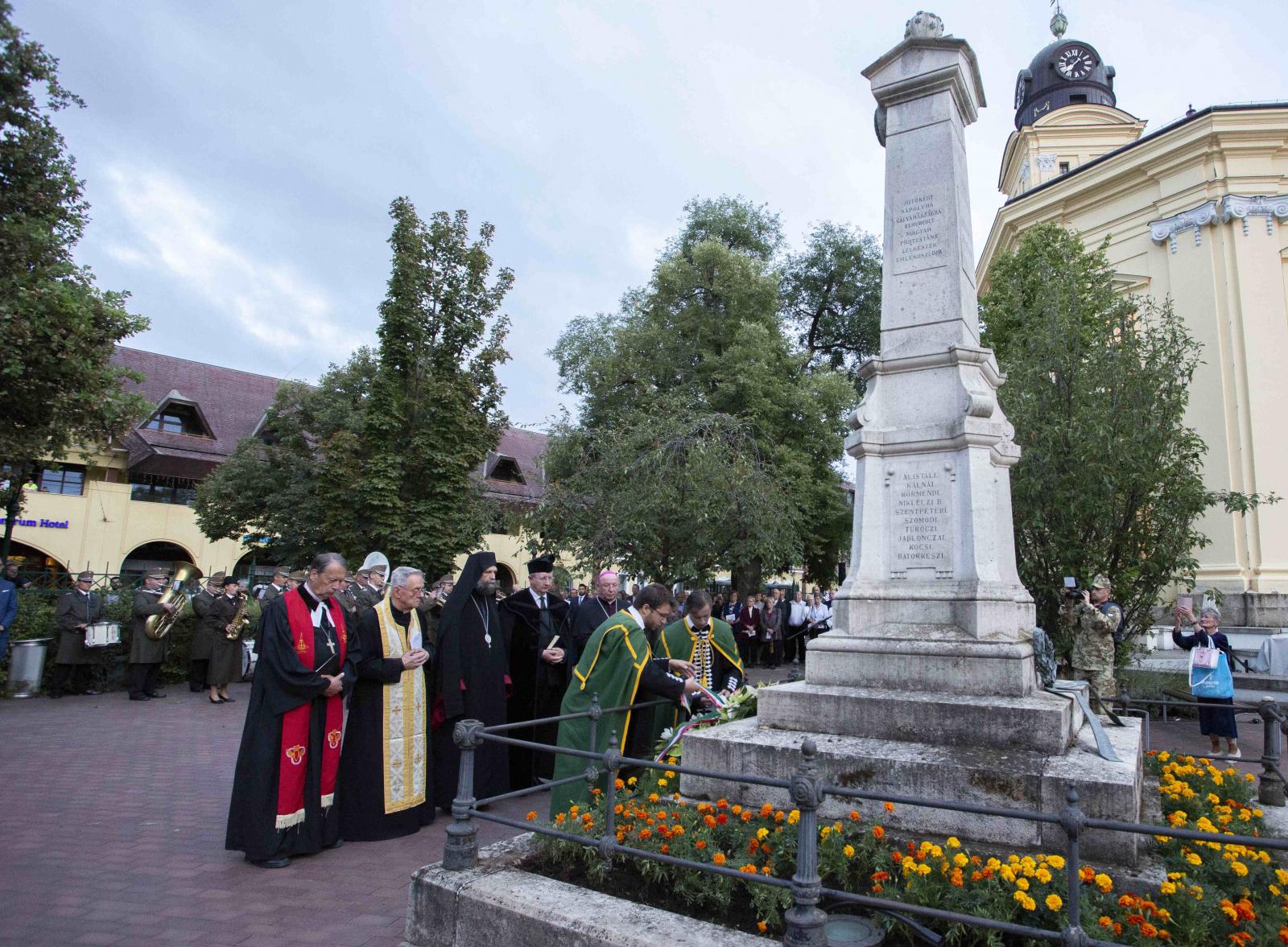 Az istentisztelet végén került sor a koszorúzásra, az emlékező, ünneplő gyülekezet együtt vonult át az Emlékkertbe. Harminc éve, 1991. augusztus 18-án II. János Pál pápa egyháztörténelmet írt, amikor személyesen helyezte el a protestáns gályarab prédikátorok emlékoszlopán a kiengesztelődés koszorúját. Ma az oszlop talapzatán egy bronzkoszorú emlékeztet bennünket a felekezetek közötti megbékélés és ökumenikus közeledés e fontos pillanatára. Emlékezve a három évtizeddel ezelőtti történelmi jelentőségű koszorúzásra, augusztus 17-én, a Debreceni Református Nagytemplomban megtartott ökumenikus igeliturgia után ismét megkoszorúzták a gályarabok emlékoszlopát. Az egység jeleként egy, közös koszorút helyezett el Gáncs Péter nyugalmazott evangélikus elnök-püspök, Kocsis Fülöp görögkatolikus érsek-metropolita, Palánki Ferenc római katolikus püspök és Fekete Károly református püspök.