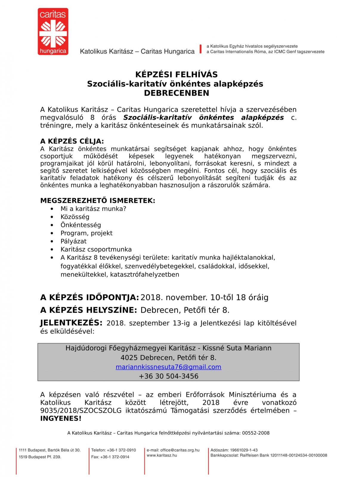 A Hajdúdorogi Főegyházmegyei Karitász az szociális-karitatív önkéntes alapképzését 2018.noveber 10-én szeretné megtartani, 10.00-18.00 óráig, délben ebéddel.