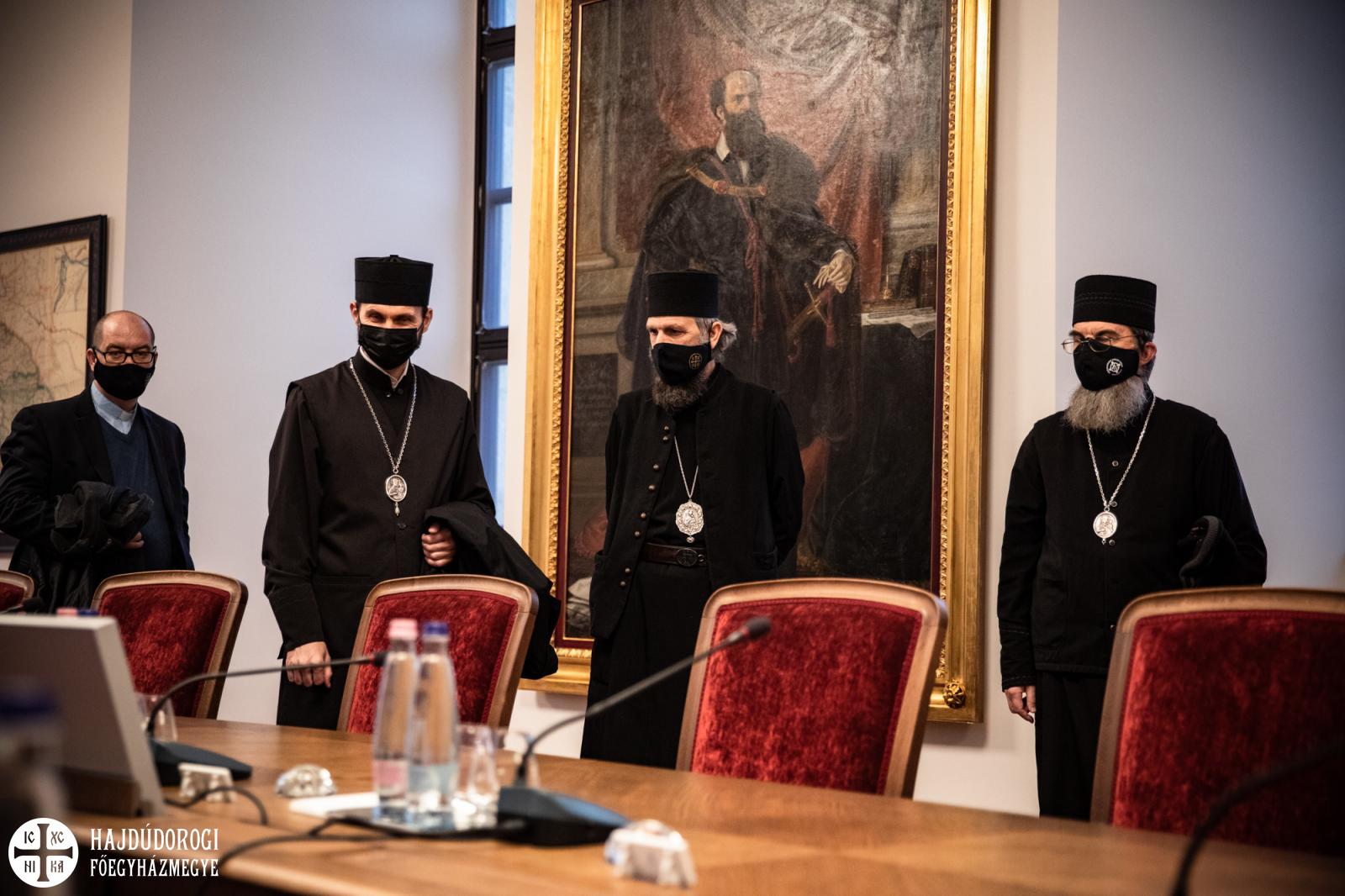 A három püspököt elkísérte Dr. Seszták István is, a metropóliai hivatal vezetője. Elsőként átadták nekik a Debrecenből hozott betlehemi lángot. Majd egy szépen zengő kántáló ének mellett a karácsony ünnepének ikonját és a metropólia néhány ünnepi kiadványát.