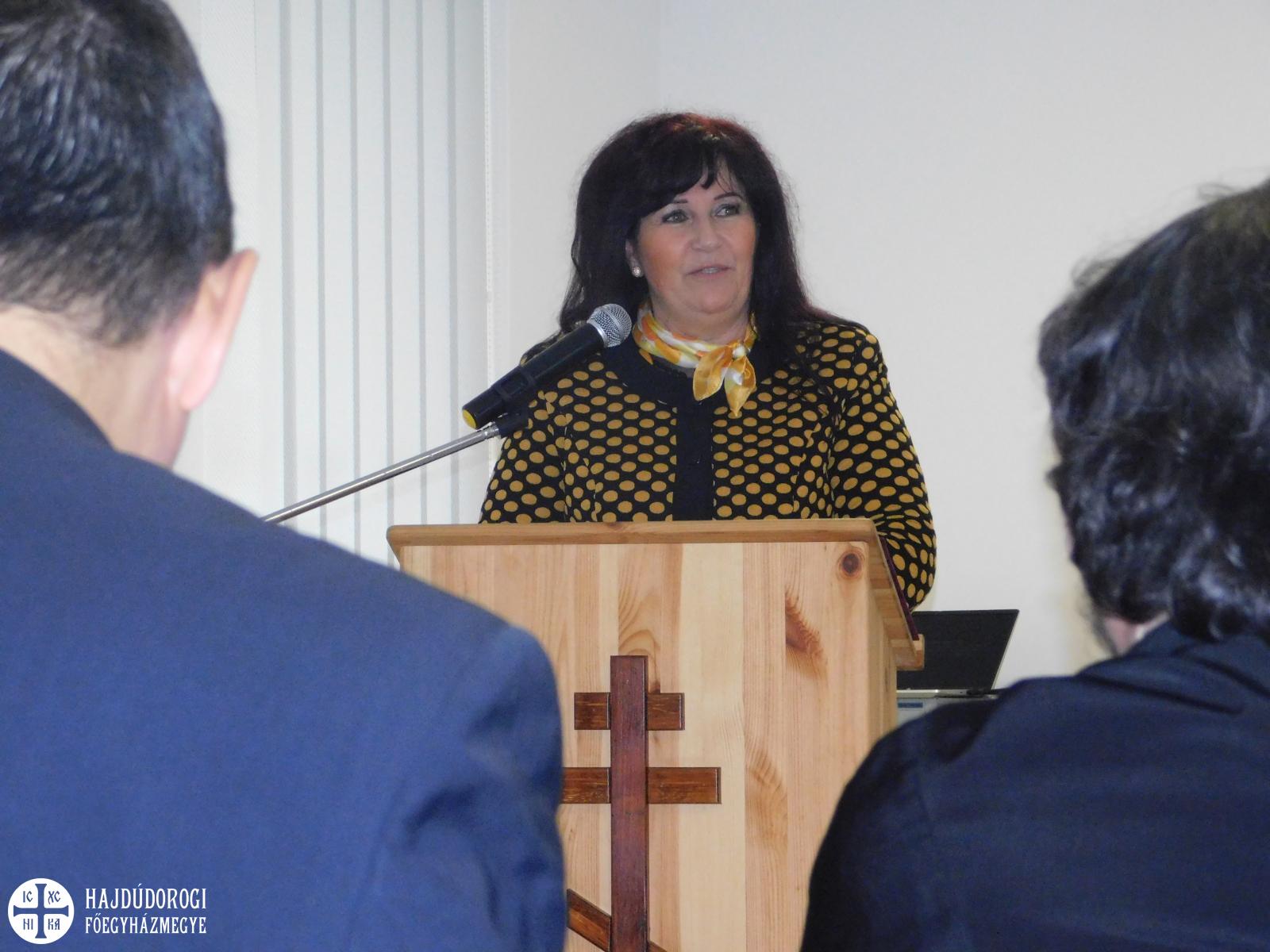 Radomszki Lászlóné helyettes államtitkár asszony is köszöntötte a jelenlévőket, aki maga is a Csereháton nőtt föl. Előadásának az „Egy szívvel, egy lélekkel” címet adta, mert a cigánypasztorációban közös célért történő munkálkodást ez fejezi ki legjobban – legyünk akár görögkatolikusok, római katolikusok, vagy protestánsok. A magasztosabb ügyekért – a krisztusi egységért, társadalmi felzárkóztatásért – csak közösen tudunk munkálkodni. Elmondta, a kormány és a politika egyedül nem tud eredményeket elérni, csak a civilek segítségével, a cigánypasztorációban dolgozókra támaszkodva. Mint mondta, minden szerveződésnek, minden közösségnek jó vezetőkre van szükség. Külön megköszönte a legjobb vezetők: Fülöp metropolita, Székely János püspök és a Boldog Ceferino Intézet áldozatos munkáját. „Mindenki annyit ér, amennyi értéket saját magából ki tud termelni.” – Idézte Márton Áron püspököt. „A cigányság hite nagy érték. Ápolni, óvni kell, hogy tudja táplálni hitünket és magyarságunkat.” Zárásként Székely János püspök szavait idézte: „Arra születtünk, hogy a szeretet dallamait játszzuk.”