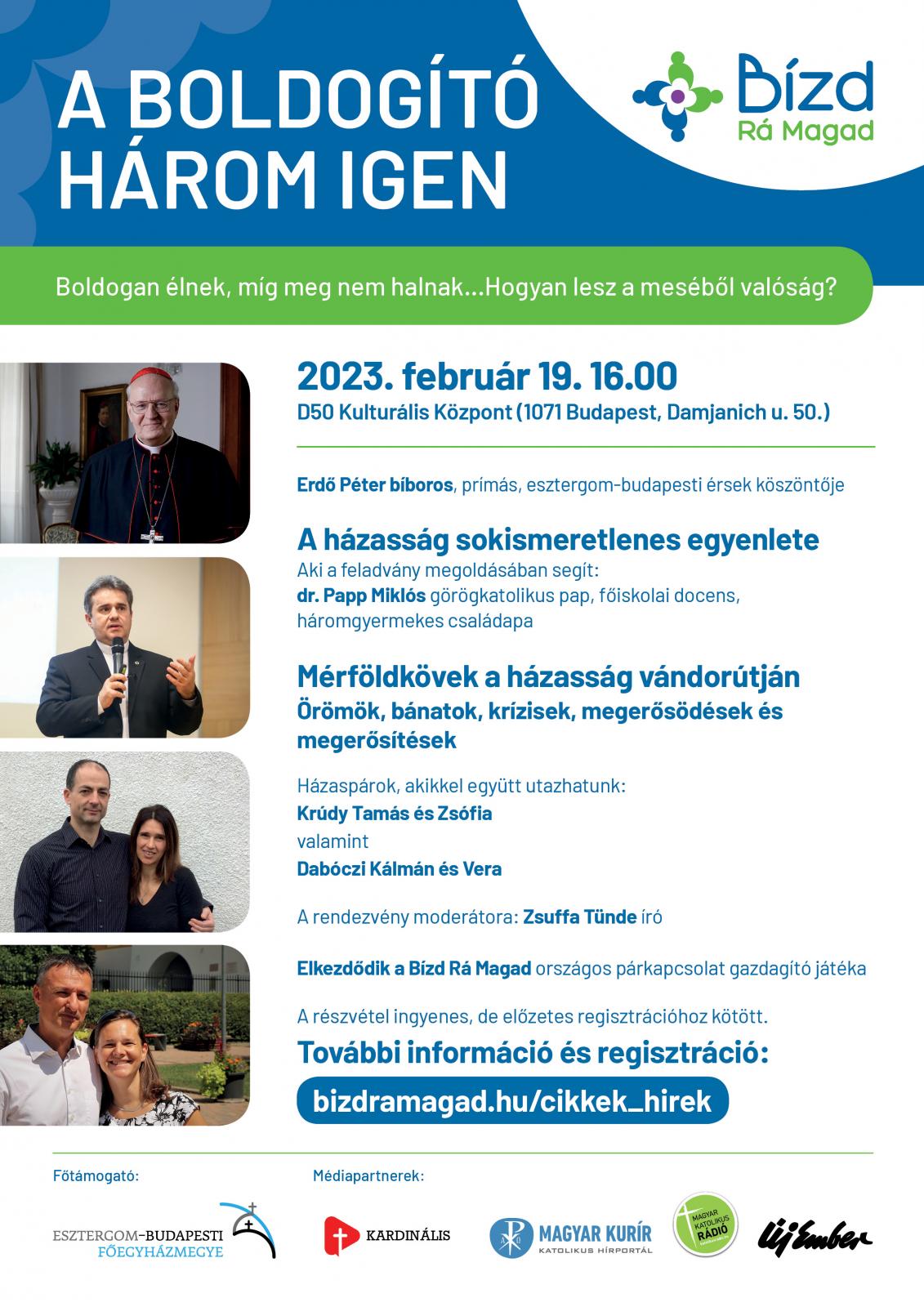Az idei évben a tizenhatodik alkalommal megrendezett Házasság Hetében a keresztény értékrend mentén dolgozó segítő szervezeteket összefogó Bízd Rá Magad Szolgálat vendégeivel a párkapcsolatok mérföldköveit tekinti át. A cél az, hogy minél felkészültebbek és nyitottabbak legyenek a párok a kapcsolataikban törvényszerűen bekövetkező változásokra. Az átalakulás kríziseiről és az azt követő gazdagodásról, megerősödésről éppúgy szó lesz, mint arról, hogy miért fontos alapja a kiegyensúlyozott házasságoknak a boldogító 3 igen.