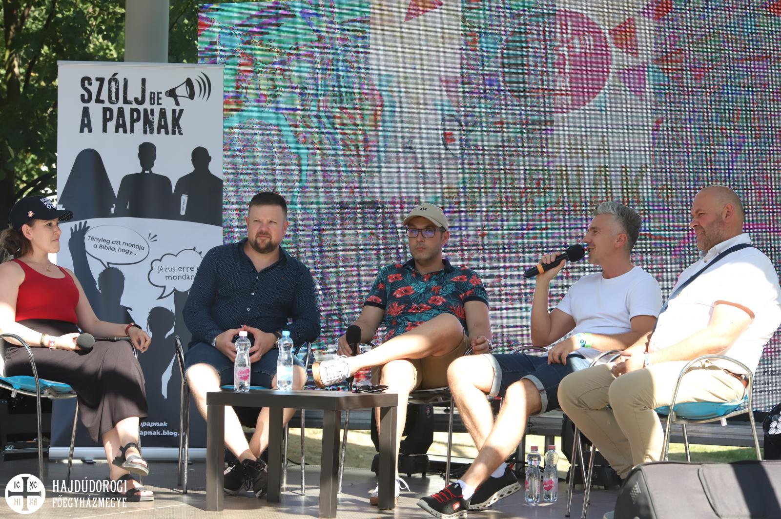 A beszélgetés végén most is szót kaphatott a közönség, ezúttal azonban nem záporoztak a kérdések, szívesebben folytattak inkább a Szólj be a papnak! sátránál személyes beszélgetéseket a résztvevők.