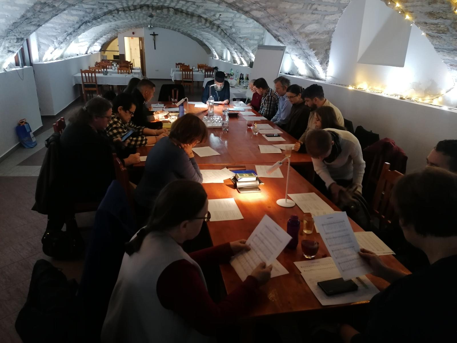 Szombaton délelőtt érsek atya tanítását kb. 25-en hallgatták. A kötetlen hangulatú gyakorlás során többek között az egyes ünnepek saját antifónáinak értelmezését, éneklését tanulmányoztuk, valamint a karácsonyi kánon dallamát. Igazi különlegesség volt pl. a bizánci dallamon énekelt "Valóban méltó" sztichira és egy ritkábban vett kerub ének.