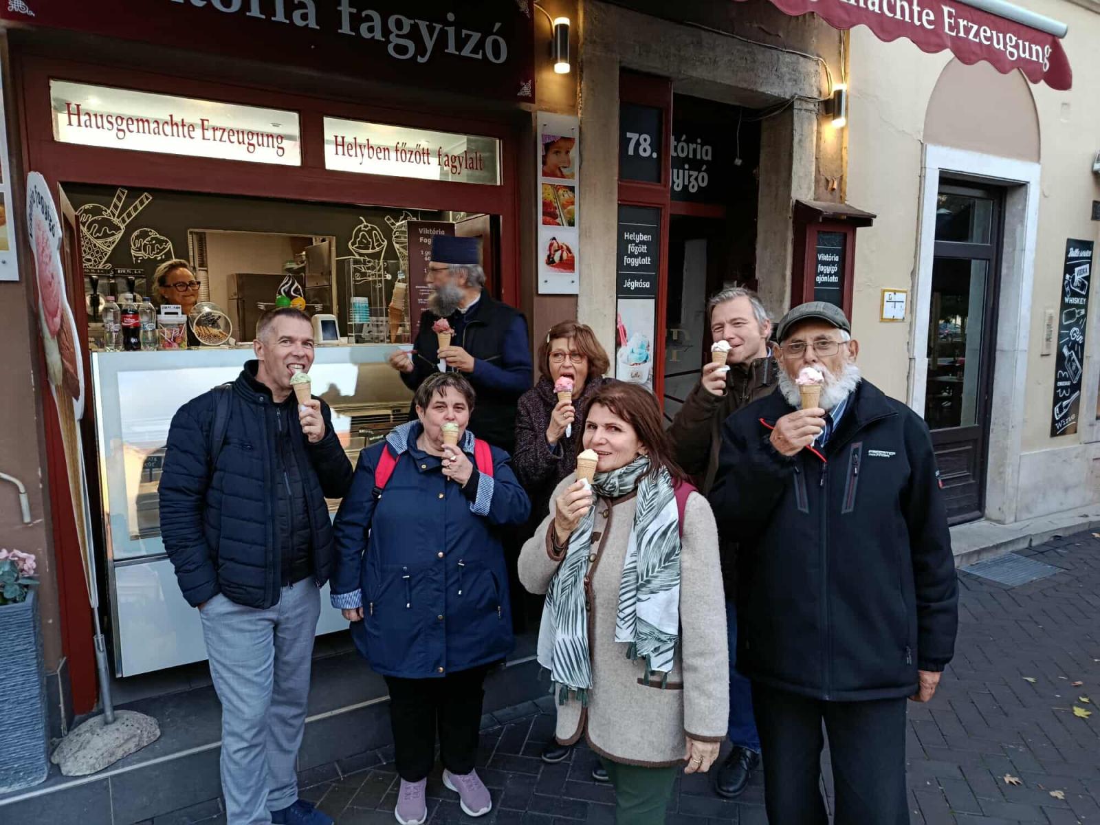 Vecsernye után idegenvezető mutatta be Sopron szakrális emlékeit, a belvárosi templomok gazdag történetét, a Kecske templom különleges építészeti értékeit, a Széchenyi család egykori temetkezési helyét, a nevezetes Kapisztrán-szószéket és az európai hírű Káptalantermet. A sok látnivaló közepette, jó idő lévén, metropolita atya még fagylaltra is meghívta a bátrabbakat...