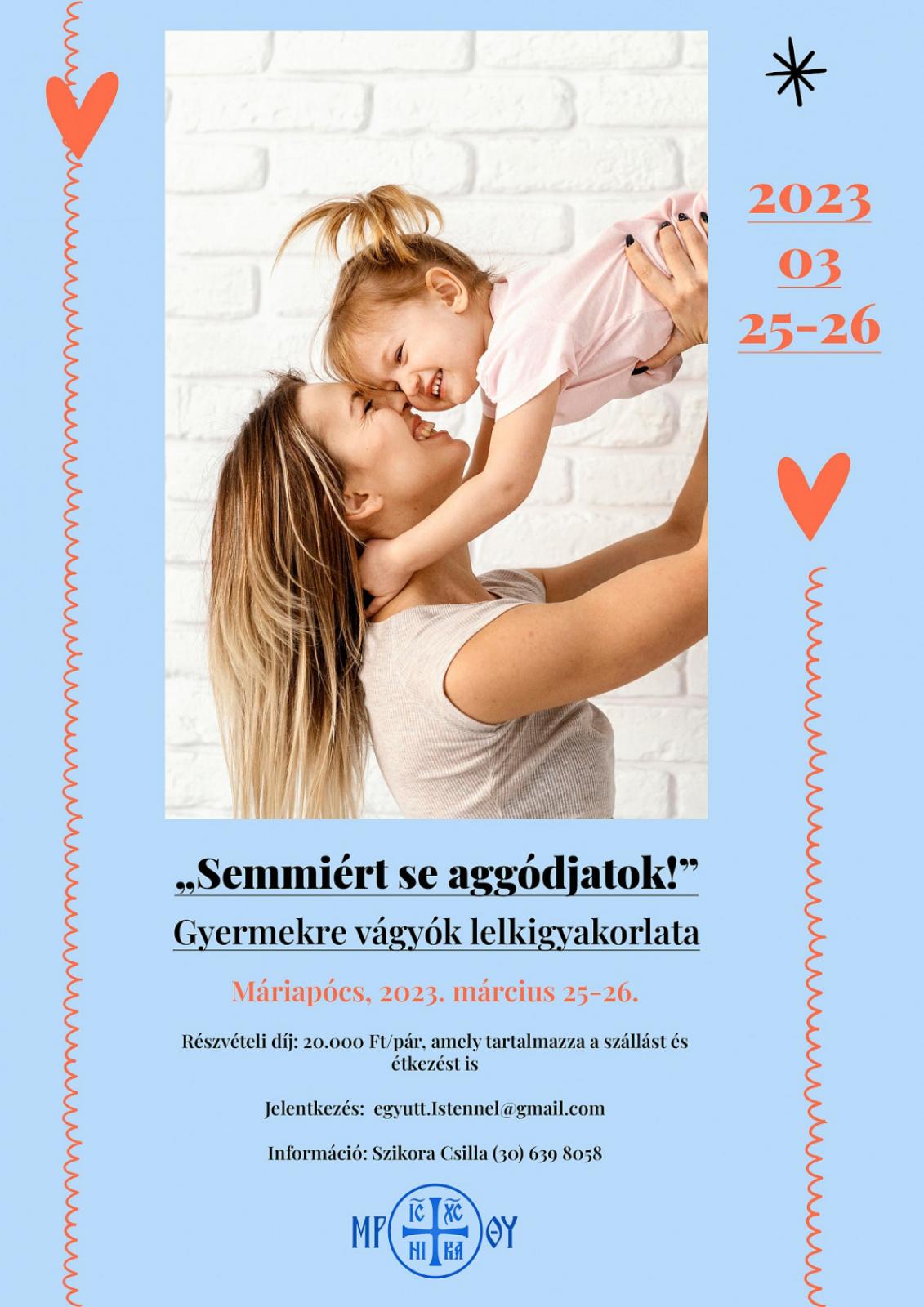 Szeretettel várjuk a Gyümölcsoltó Boldogasszony ünnepén, 2023. március 25–26-án tartandó lelkigyakorlatunkra azokat a házaspárokat, akik több éve várnak arra, hogy a Jóisten megajándékozza őket gyermekkel, szeretnék kérésüket, fájdalmukat, reményüket a máriapócsi Szűzanya elé letenni.
