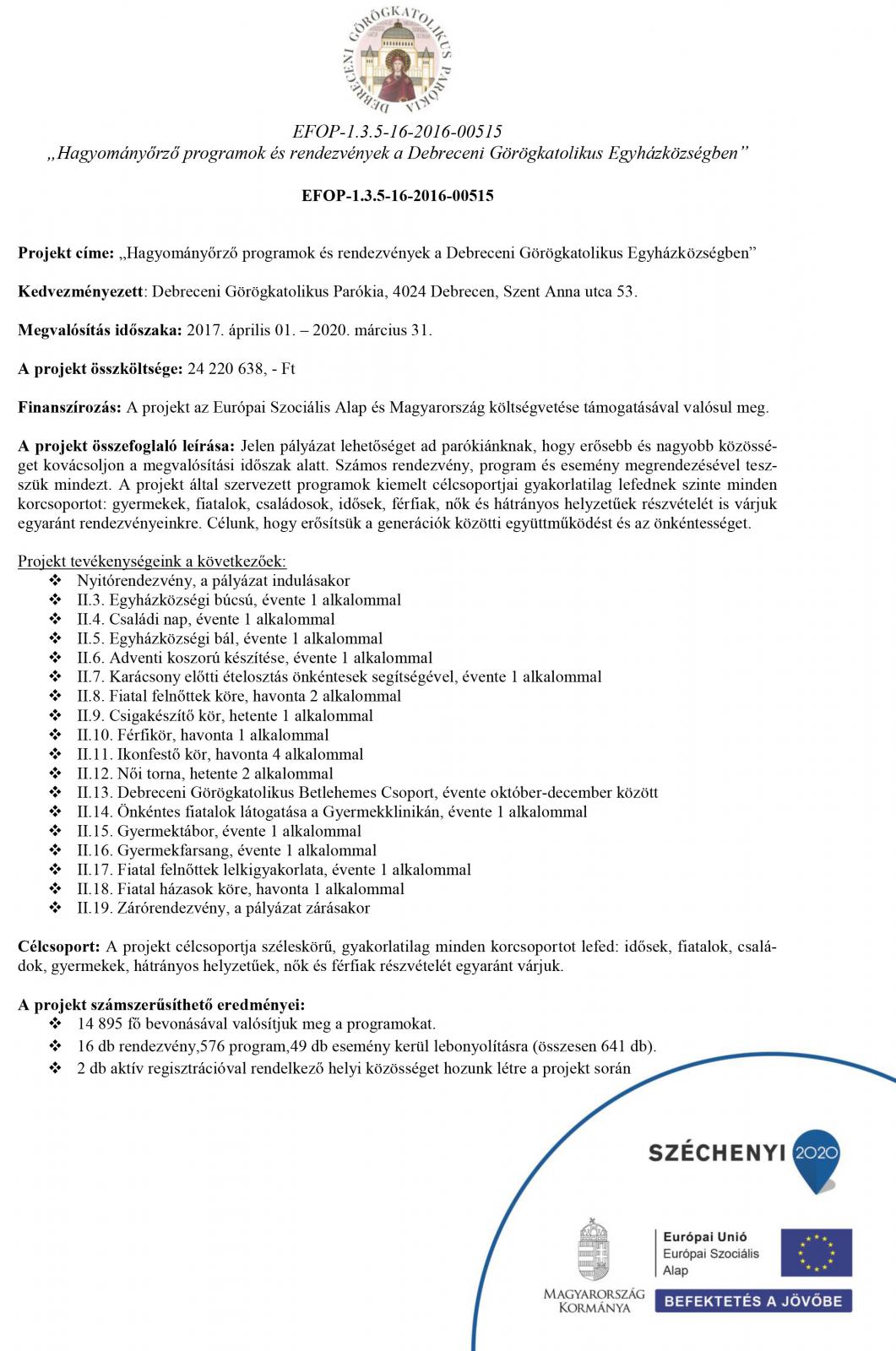 Projekt címe: „Hagyományőrző programok és rendezvények a Debreceni Görögkatolikus Egyházközségben”