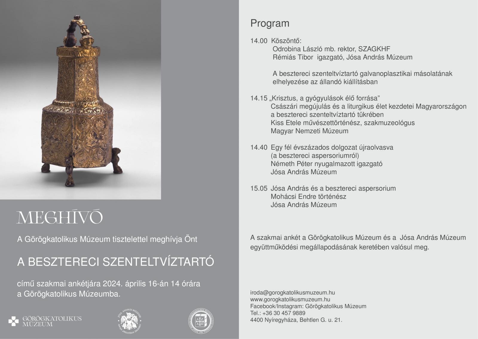 A Görögkatolikus Múzeum április 16-án 14 órától a „Besztereci szenteltvíztartó” címmel szakmai ankétot rendez. A besztereci szenteltvíztartó a keleti egyházi liturgikus gyakorlat első ismert tárgyi emléke az Árpád korból. A rendezvény során a besztereci szenteltvíztartó galvanoplasztikai másolatát helyezik el az állandó kiállításban.