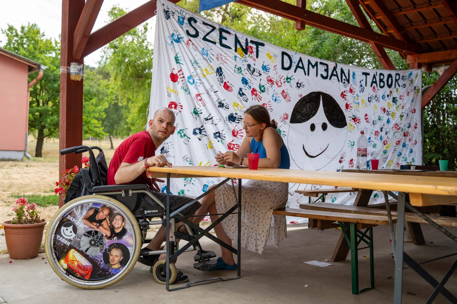 Tamással (37 éves, táborozó) csoportjának fellépése előtt beszélgettünk. Súlyos oxigénhiánnyal született, ami a mozgásirányító központját és beszédközpontját károsította. Az életét kerekesszékben éli. A külvilággal leginkább csak írásban tud kommunikálni, de itt a táborban segítője már jól érti beszédét, minél tovább beszélgetünk, annál ügyesebbek leszünk mi is. Tamás verseket ír, amelyben édesanyja segíti a jegyzetelésben. A tábor költségeinek előteremtéséhez írta Adjuk össze című versét és ő a tábor dalának szövegírója is.