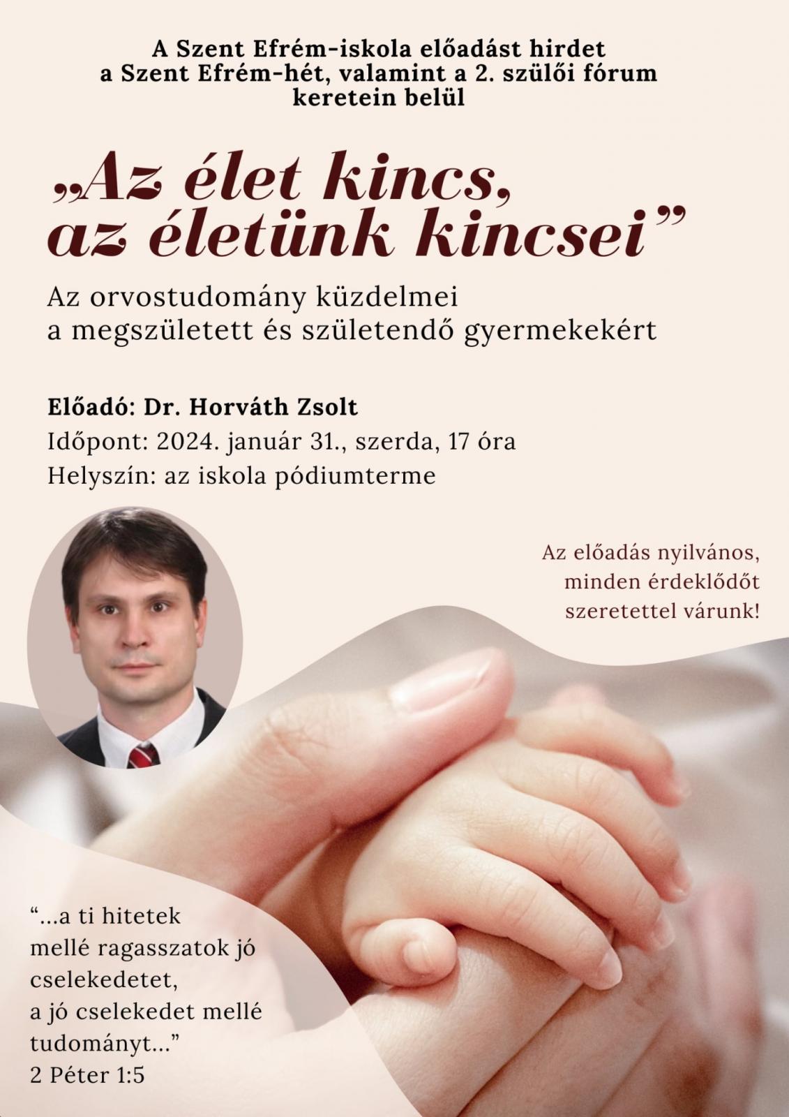 A szülőknek is tartogatnak programot erre a héte: Az élet kincs, az életünk kincsei – az orvostudomány küzdelmei a megszületett és születendő gyermekekért. Ezzel a címmel tart előadást dr. Horváth Zsolt az iskolában. A belépés díjtalan. Az előadás után lehetőség van bekapcsolódni az iskola karitatív adománygyűjtésébe, mely idén a fogyatékkal élőket táboroztató Szent Damján kört támogatja.