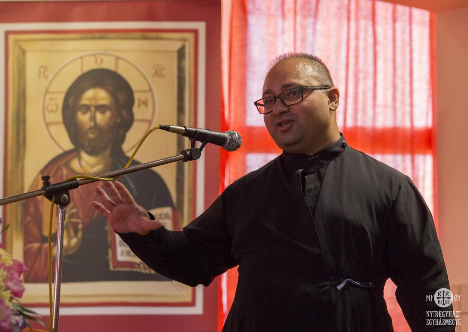 Dr. Balogh Győző Rakacán szolgáló segédlelkész atya Az Eucharisztia ünneplése a cigánypasztorációban címmel gondolkodott együtt a hallgatósággal. Ő mint a Görögkatolikus Metropólia elsőként felszentelt cigánypapja a leghitelesebben tud szólni arról, hogyan látja a cigányság hitéletét, milyen cigányként cigányok között szolgálni, és közösségével együtt megélni a hétköznapokban az Eucharisztia titkát. Ahogyan az Eucharisztia mindennek forrása és csúcsa, úgy Jézus Krisztus a cigányság legfőbb vajdájaként is aposztrofálható (ld. dr. Balogh Győző: Krisztus a legfőbb vajda). A hét szentséget – melyet a következők kapcsolnak össze: Krisztus alapította őket, kegyelmi erőt közvetítenek, bekapcsolnak az egyházba, közösségben kell megélni őket – vette sorra, és saját, néhány éves tapasztalatát osztotta meg a hallgatókkal a szentségek tükrében.