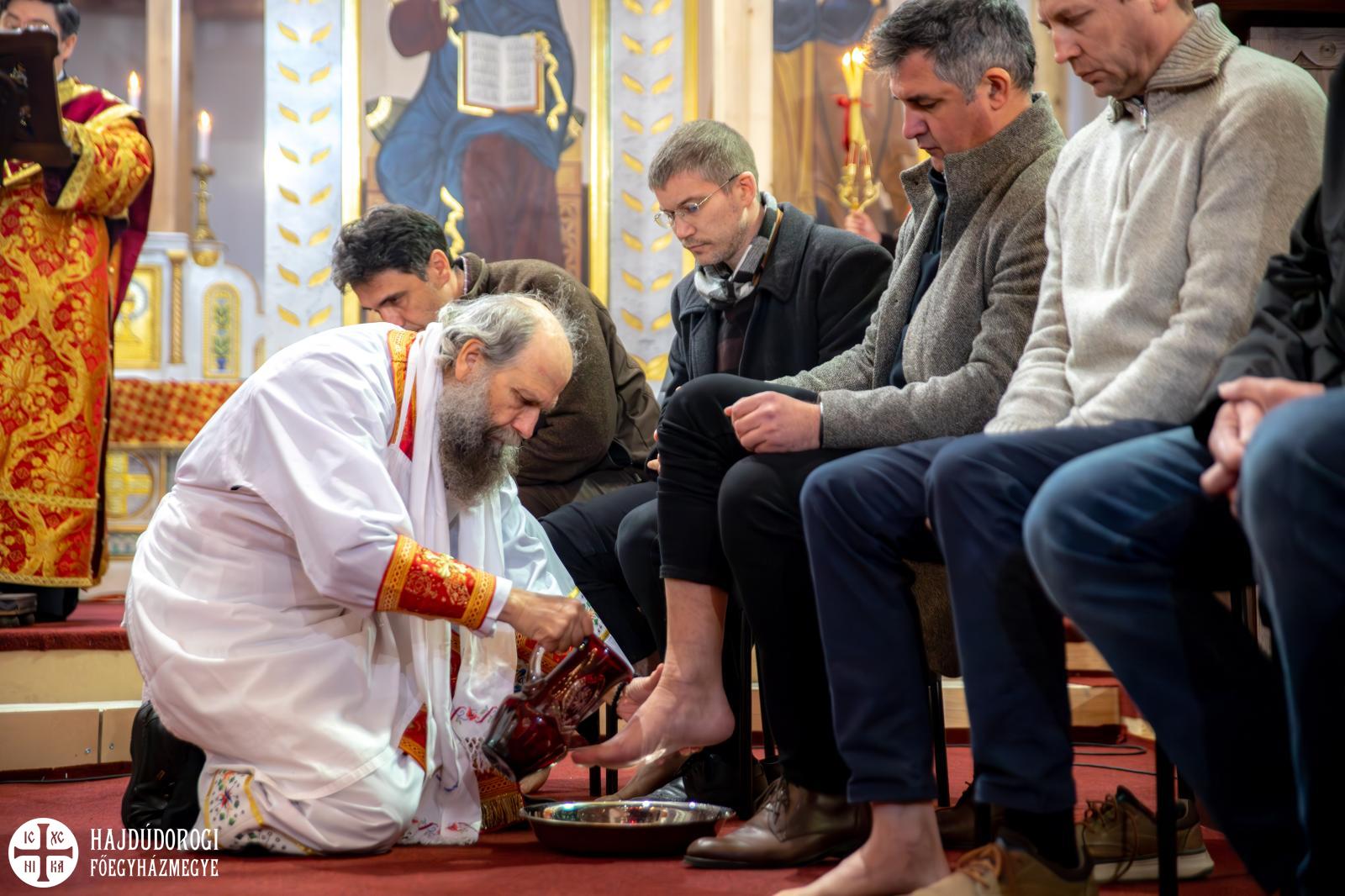 A nagycsütörtöki evangéliumban halljuk, hogyan mosta meg Jézus tanítványainak lábát. Ez a cselekedet örök időkre szóló példaadás, hogyan kell egymást alázatos szívvel szolgálni. A lábmosás szertartásában Jézus példájára emlékezik az Egyház. A szertartás végére a szentély előtti térben a paptestvérek és szolgálattevők helyét civil emberek vették át. Ekkor kezdődött el a lábmosás szertartása, ami közben Nyirán János fődiakónus olvasta fel az erről szóló Evangéliumot, Fülöp metropolita pedig megjelenítette az abban hallottakat: Krisztust utánozva levetette felső ruháját, derekára kendőt terített, kezébe kancsót vett és sorra letérdelt az emberek elé, megmosta és megcsókolta lábukat.
