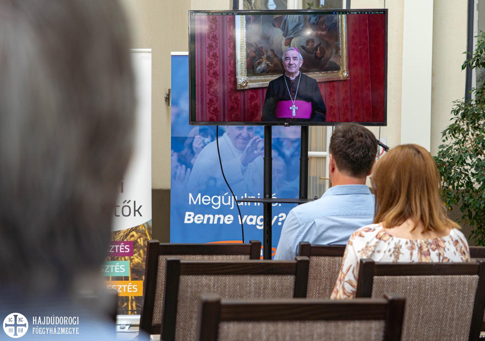 Pál József Csaba temesvári megyéspüspök videó üzenetben köszöntötte a szinodalitás jegyében összegyűlteket. Mint fogalmazott: új evangelizációra van szükség, melynek mindannyian részesei, a missziós lelkület által nemcsak tárgya, de alanyai is lehetünk. A sinodos szó együtt járást jelent. Jézus azért küldte párban a tanítványokat, hogy ezzel tanúságtevőkké is váljanak. Csaba püspök köszöntőjében kiemelte a fíliák, egyháztanácsok, kórusok, karitászcsoportok és egyéb (kis) közösségek jelentőségét, hiszen ezek mind Isten valamely karizmája mentén születnek. A kis közösségekben is erő lakozik, lelki központtá válhatnak, így jelenlétük már önmagában is misszió lehet.
