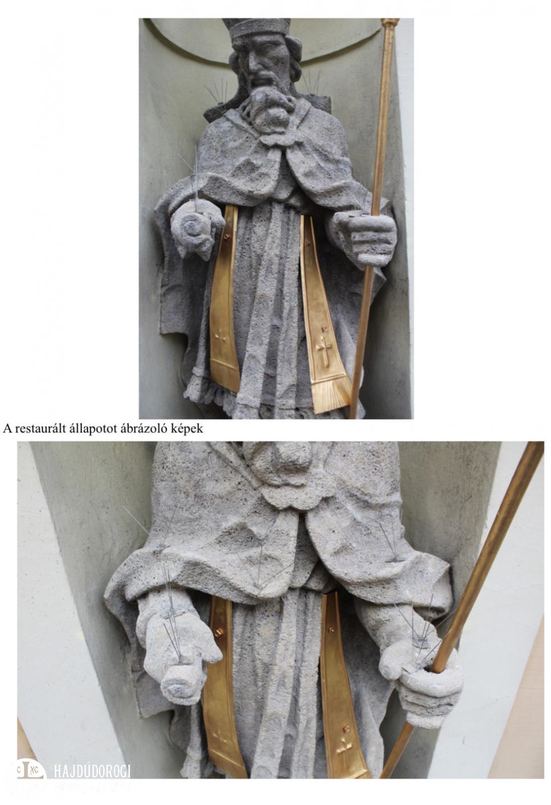 A tavalyi restaurálást Egry Hunor restaurátorművész végezte, míg a szükséges állványzatot Fabók Balázs cége felajánlásból biztosította. „Állványzatra azért volt szükség, mert ezeket a nehéz szobrokat nem lenne egyszerű ilyen magasról leemelni, és nem is voltak olyan rossz szerkezeti állapotban, hogy erre szükség lett volna, így restaurálásuk a helyszínen zajlott” - meséli Fabók Balázs. Nagyjából szeptembertől október végéig zajlottak a munkálatok. „Talán nem is annyira szembeötlő a változás, pedig sok minden történt a szobrokkal: a fém atribútumokat konzerválták és újraaranyozták, szemcseszórásos tisztítással eltávolították a felületi szennyeződéseket, mely a nagyvárosi környezetben jelentős mértékben besötétítette a szobrokat és kémiai károsodásokat is elindított a kőanyagban” – meséli a görögkatolikus szakember.