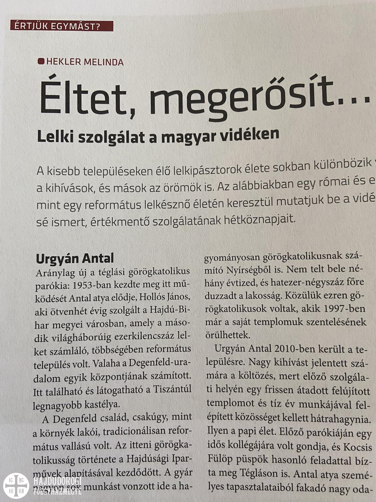 Urgyán Antal 2010-ben került a településre. Nagy kihívást jelentett számára a költözés, mert előző szolgálati helyén egy frissen átadott felújított templomot és tíz év munkájával felépített közösséget kellett hátrahagynia. Ilyen a papi élet. Előző parókiáján egy idős kollégájára volt gondja, és Kocsis Fülöp püspök hasonló feladattal bízta meg Tégláson is. Antal atya személyes tapasztalataiból fakadó nagy odafigyeléssel és szívvel végezte a feladatot. „Két nagyszülőmet is mi gondoztuk otthon a szülői házban, mindenkinek ki kellett vennie belőle a részét, a mindennapi feladataink elvégzése mellett.” Amikor egy év múlva az idős pap meghalt, Antal atya albérletét a parókiára cserélte. A költözést alapos felújítás előzte meg, amelynek hatalmas közösségszervező ereje volt. „Nagyon sok pénzt megspóroltunk azzal, hogy miután kihirdettük a templomban a felújítás elindulását, azonnal életerős fiatalemberek jöttek kalákában dolgozni. Munka közben főztünk, beszélgettünk, és ebből jó kis közösség alakult.”…