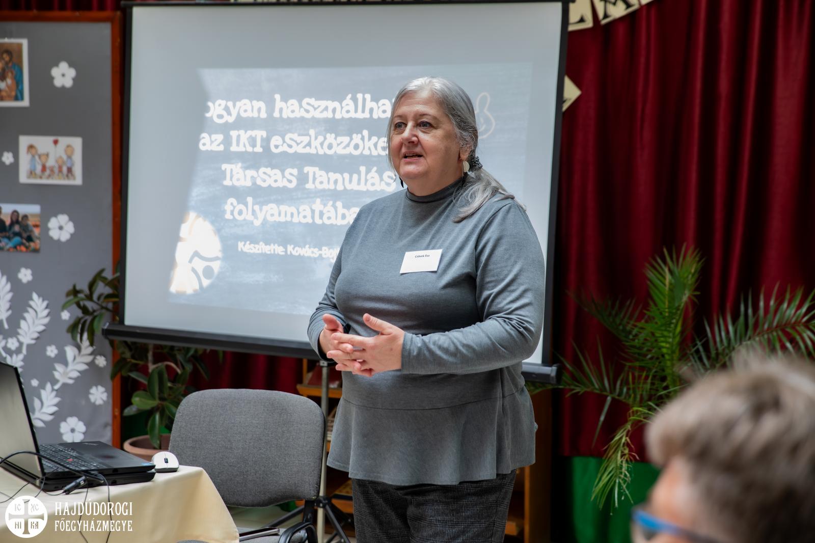 A délután műhelymunkával folytatódott, melyet Bencze Györgyné és dr. Benda József moderált. Czövek Éva oktatási referens köszöntőjében háláját fejezte ki a pedagógusoknak, akik részt vesznek ebben a programban, és időt, energiát nem sajnálva rengeteget tanulnak és dolgoznak annak érdekében, hogy a Társas Tanulás módszertan minden intézményükben beindulhasson. Hangsúlyozta, a konferencia egyik legfontosabb tétje, hogy az online mentorálásokat követően személyesen is meg tudjanak mutatkozni egymásnak a munkatársak.