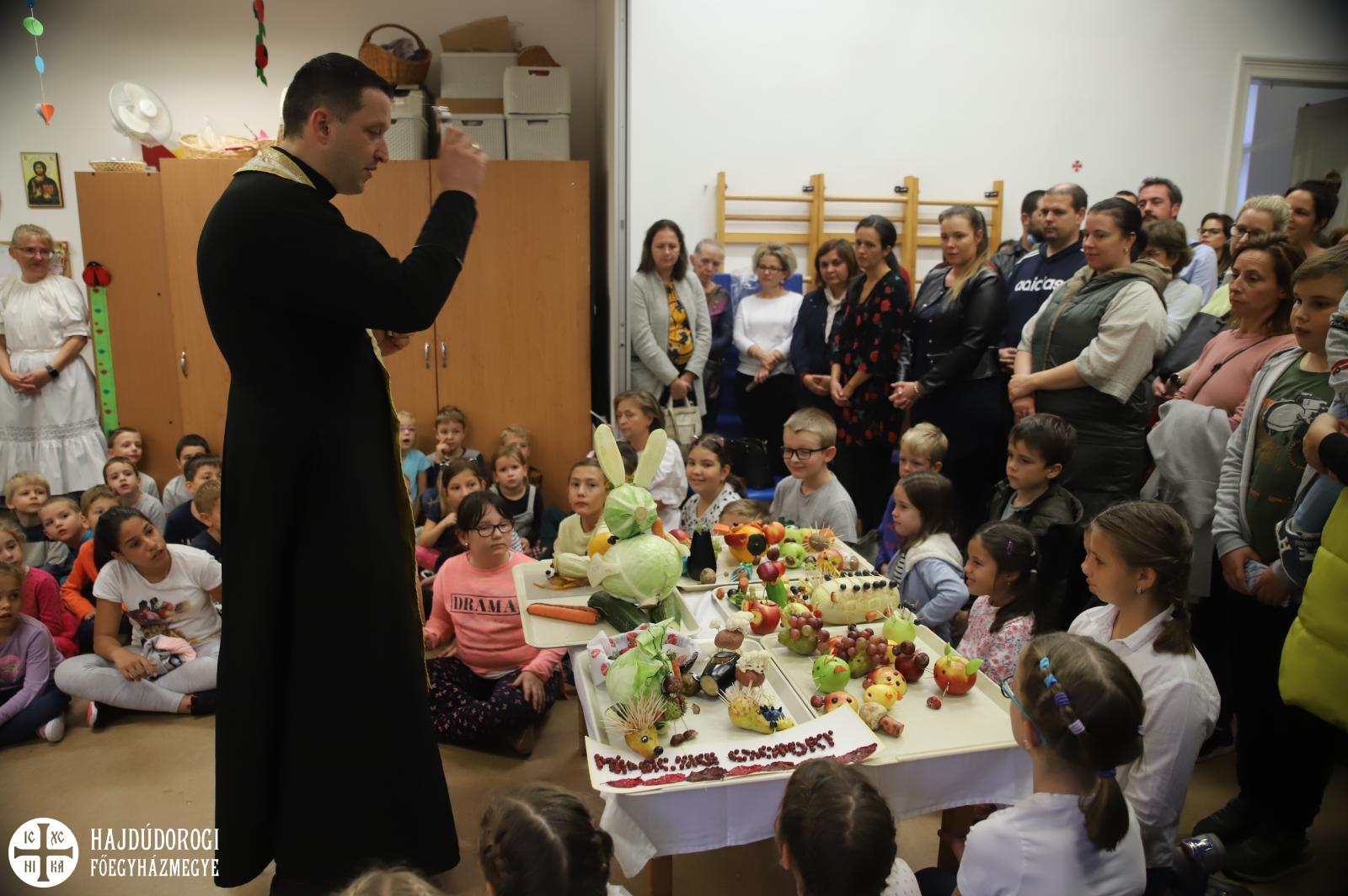 Az időjárás idén sajnos nem kedvezett a kinti programoknak, így a csoportszobákban adták elő az apróságok produkcióikat szüleik, hozzátartozóik előtt. A Szent Efrém ovisai mellett az általános iskola diákjai is bemutatkoztak. A mulatság kezdéseként Gánicz László atya áldotta meg az ősz különféle terményeiből elkészített figurákat.