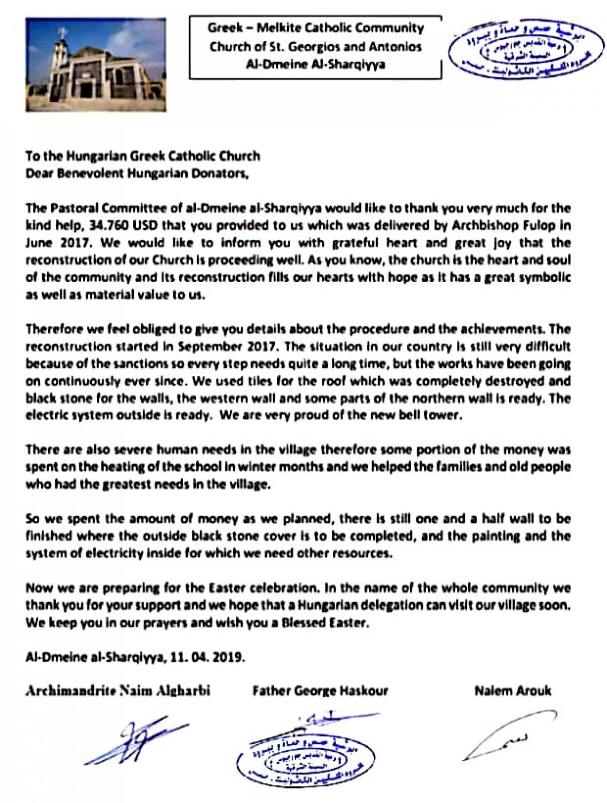 „Az al-dmeinei parókia nevében köszönetünket fejezem ki a magyar Görögkatolikus Metropóliának és külön Fülöp érsek atyának, mert a tőlük kapott adományból építettük újjá a templom teljes tetőszerkezetét, az egész nyugati falat és a templomtornyot. Köszönjük Biankának (Speidl Bianka a Migrációkutató Intézet vezető kutatója – a szerk.), aki itt van velünk és Bushrának is, akik segítettek az ügyben. Köszönjük az egész közösség nevében a segítséget és a hozzájárulást templomunk szépségének helyreállításához. A külső falon elhelyezett két ikon Mtanios és Rakan Nadim Qarduh adománya. Az ikonok Szent Antalt és Szent Györgyöt ábrázolják, akik templomunk védőszentjei.”