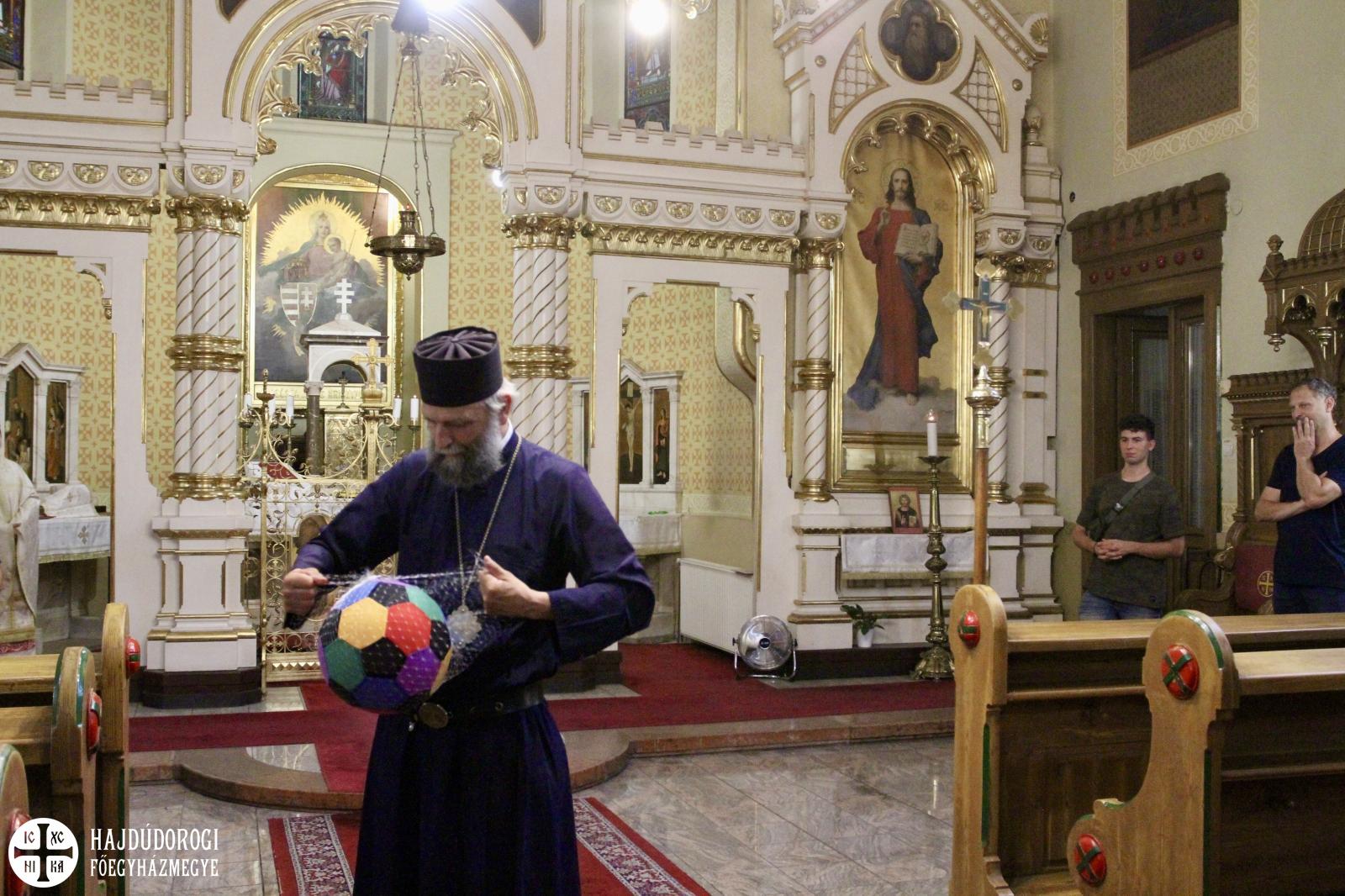 A zarándokok nevében Verdes Miklós atya egy erre az alkalomra készíttetett kulacsot adott át Fülöp atyának, míg ő egy színes, puha labdát adott a ministránsoknak. Ahogy mondta, még egy parkolóban labdázva sem tudnak senkinek kárt okozni.