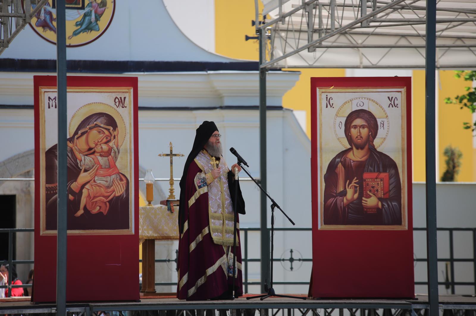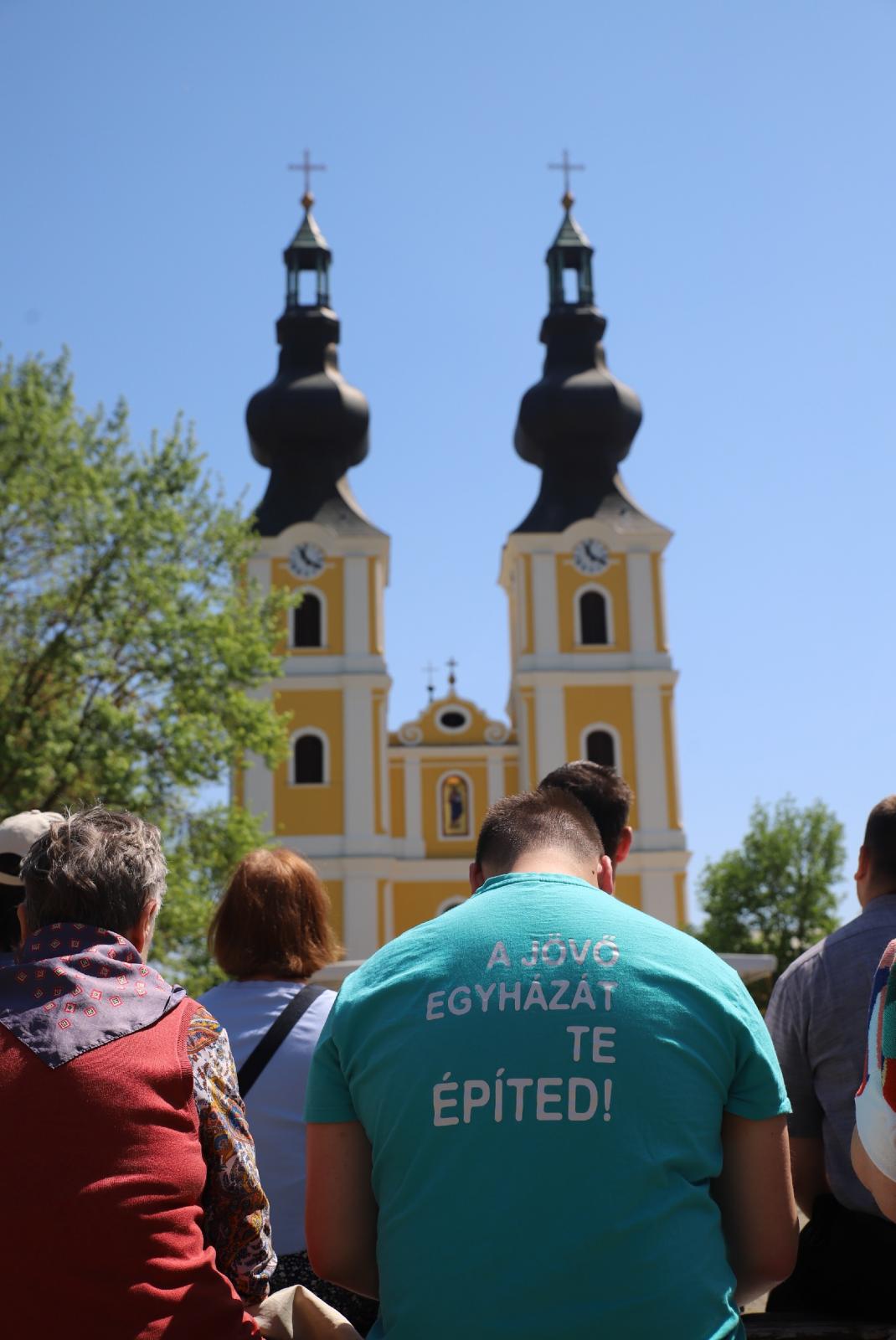 Templommá változott a tér, és zarándokok százai imádkoztak együtt. Püspök atya a búcsú mottójára (úton vagyunk) utalva azt mondta, akkor van értelme útra kelni, ha hiszünk. Imádkozott az úton lévőkért, a háború elől menekülőkért, „akiknek semmijük nem maradt, csak mindenük, az Isten.”