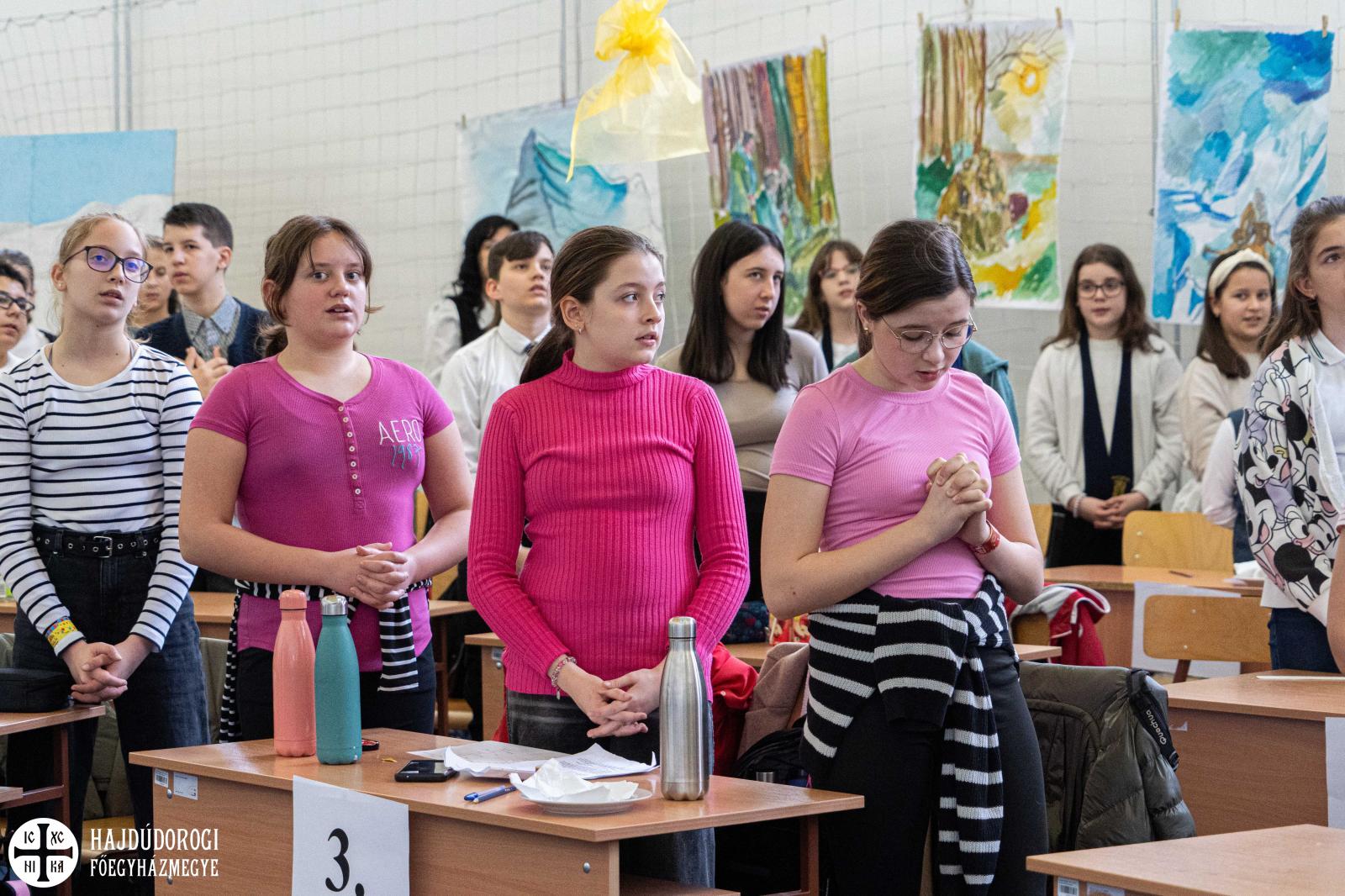A verseny kezdetén közösen imádkoztuk el a Miatyánkot, Boros András görögkatolikus parókus, iskolalelkész pedig áldást adott a versenyre érkezőkre.