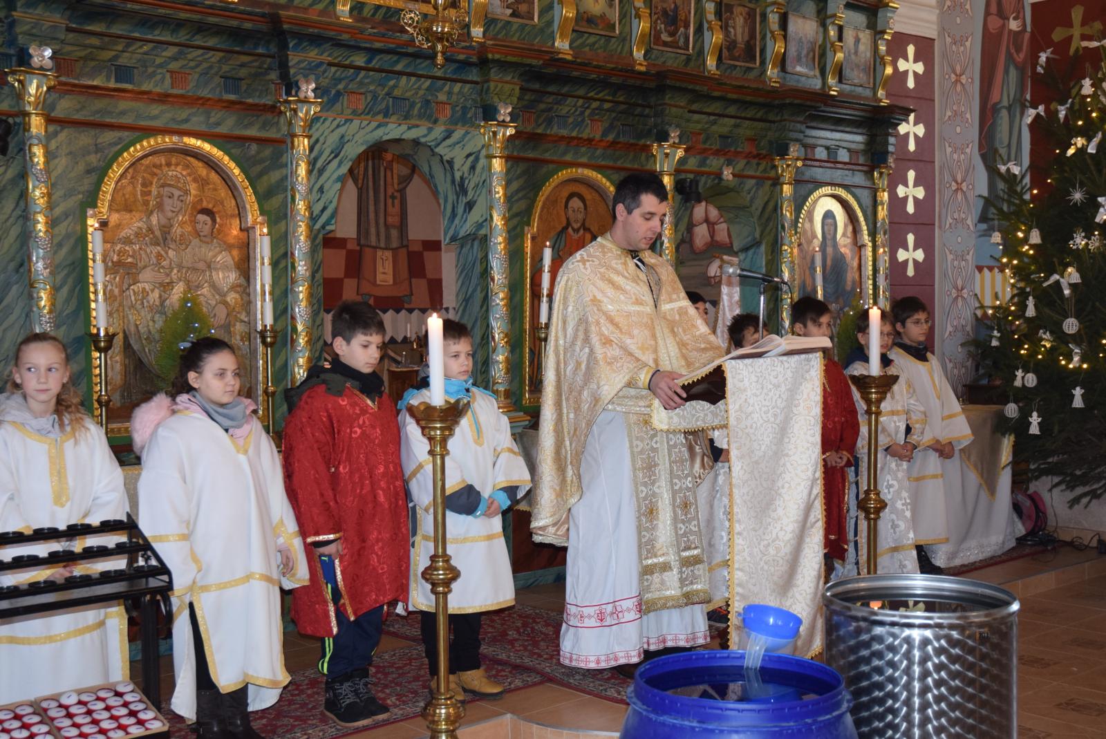 A gyermekek liturgiáját követően Tóth Elek parókus atya a felnőtt hívek népes serege előtt szentelte meg a vizet, melybe először a háromágú gyertyát, majd pedig a keresztet merítette alá háromszor.