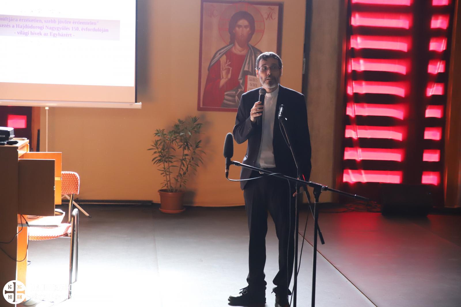 „Napirend előtti felszólaló” volt Vatamányné Kiss Krisztina, aki személyes emlékeit idézte fel. Ugyanis édesapja – a Hajdúdorogon harminc évig tevékenykedő – Kiss Andor atya és felesége, valamint az akkor káplánként szintén itt szolgáló Polgári László atya vezetésével az akkori fiatalok is tartottak a nagygyűlésről megemlékezést, 1988-ban. A nosztalgia alapját adó, történelmi jelentőségű eseményről Dr. Véghseő Tamás, a Szent Atanáz Görögkatolikus Hittudományi Főiskola rektora számolt be részletesen. „Ki múltjára érzéketlen, szebb jövőre érdemtelen” című előadásában elhangzott, hogy a görögkatolikus egyházmegyékben élő magyar anyanyelvű hívek körében a 18. század közepétől jelentkezett egyre erőteljesebben az az igény, hogy templomaikban a magyar nyelvet használhassák az általuk nem értett ószláv és a román helyett.