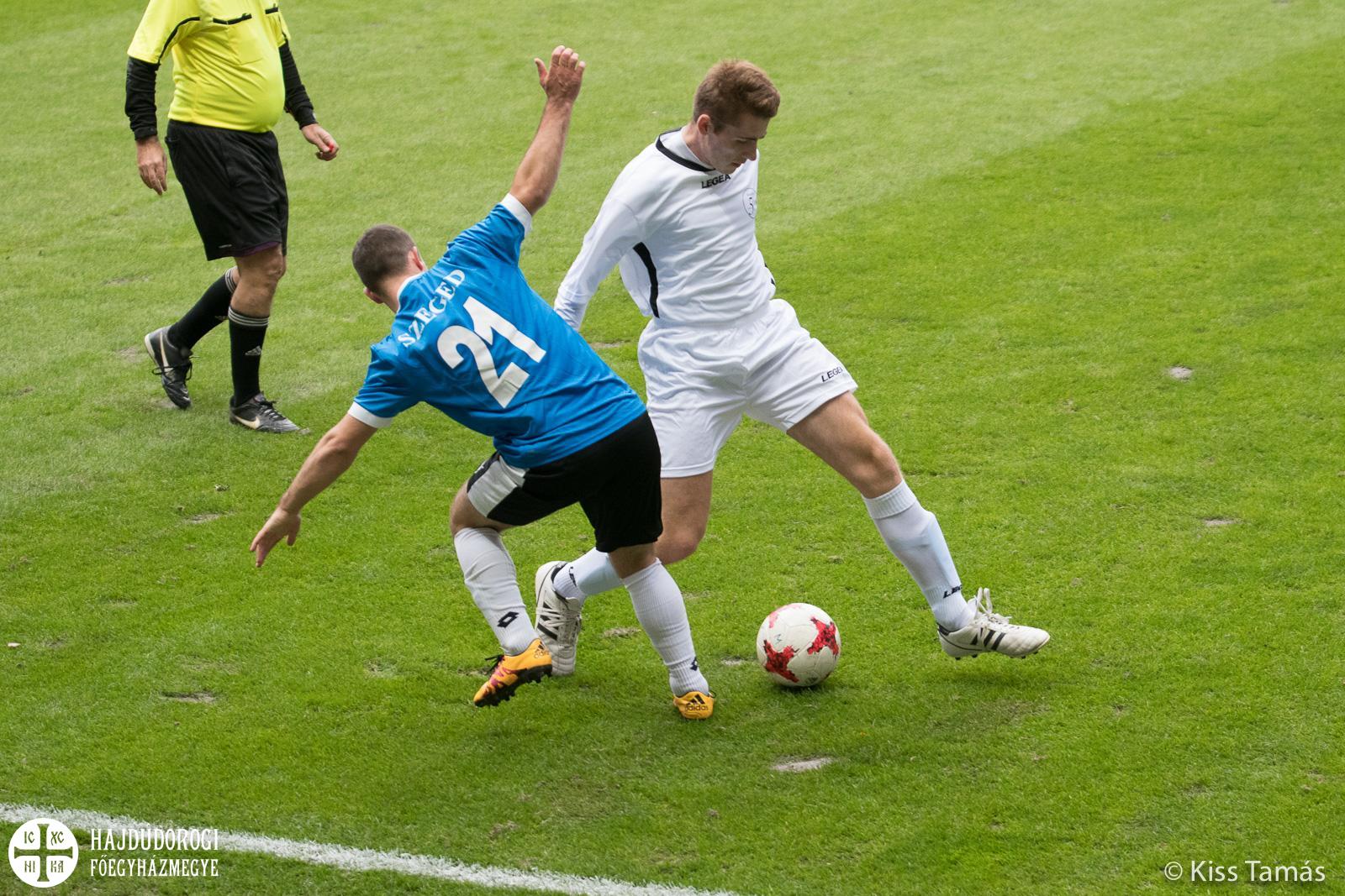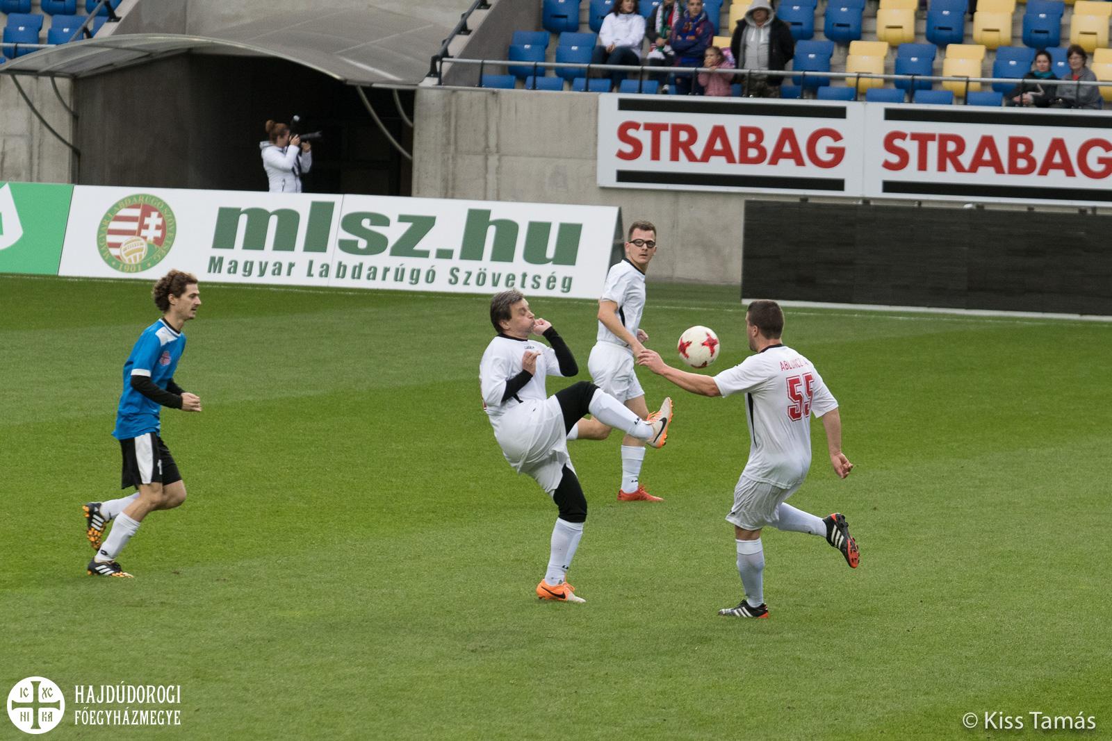A kék mezes katolikus csapat tizenhatosán belül a labda