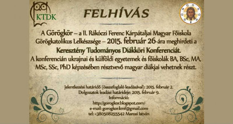 A Görögkör – a II. Rákóczi Ferenc Kárpátaljai Magyar Főiskola Görögkatolikus Lelkészsége – 2015. február 26-ra meghirdeti a II. Keresztény Tudományos Diákköri Konferenciát. A konferencián ukrajnai és külföldi egyetemek és főiskolák BA, BSc, MA, MSc, SSc, PhD képzésében résztvevő magyar diákjai vehetnek részt.