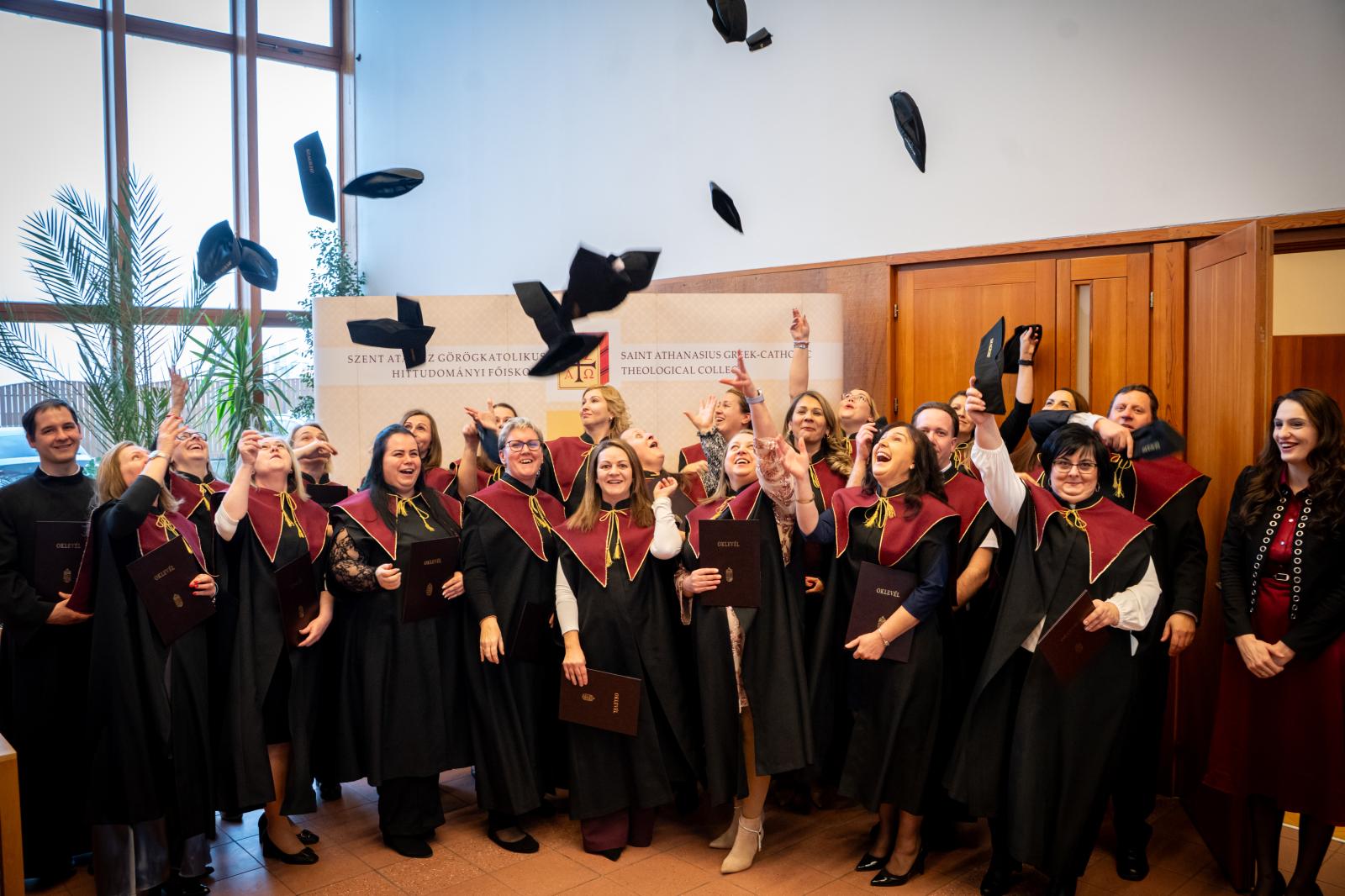 A hivatalos esemény zárásaként a friss diplomások az elnökség tagjaival és oktatóikkal közösen a Szent Péter-teremben vettek részt egy ünnepi koccintáson. Ezt követően az ünneplés a családtagok körében folytatódott: a főiskola aulájában hosszú ideig tartott a vidám fotózkodás a kihelyezett fotófal előtt, megörökítve ezt a felejthetetlen napot.