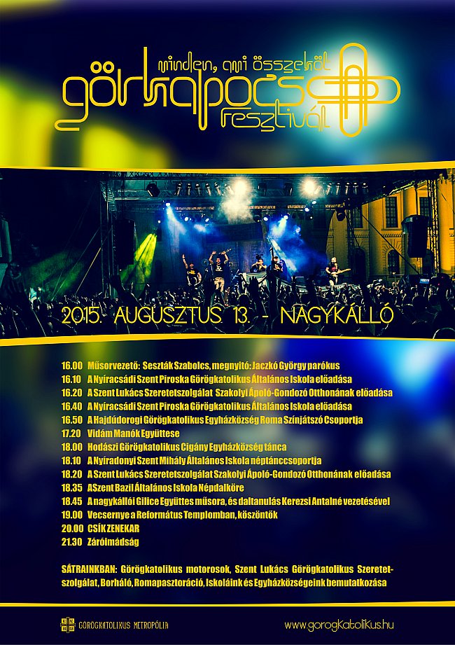 Szeretettel tájékoztatjuk görögkatolikus egyházunk híveit és a kedves érdeklődőket, hogy 2015. augusztus 13-án Nagykálló ad otthont, a már hagyományosan megrendezendő nagy sikerű Görkapocs Fesztiválunknak!