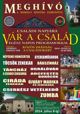 Idén július 12-én, Szerencsen lesz a Miskolci Apostoli Exarchátus családi napja. A rendezvény számos színes programmal várja az érdeklődőket. A kikapcsolódni és együtt lenni vágyóknak változatos gyermekműsorokat (bábszínház, táncház), interaktív foglakozásokat (kézműves foglalkozás, cserkészvetélkedő), népzenei koncerteket (Ciráda zenekar, Tücsök zenekar, Újváry Marika és kísérete) és egyéb szórakozási lehetőségeket (ugrálóvár, arcfestés, állatsimogató, bohócok, zumba) kínálnak a szervezők. A rendezvény plakátja lentebb található.