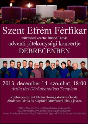 Az Európai Keresztény Kultúráért Egyesület – Debrecen Megyei Jogú Város Ruszin Nemzetiségi Önkormányzata és a Debreceni Görögkatolikus Egyházközség megbízásából – szeretettel hív és vár minden érdeklődőt és műértőt a világhírű Szent Efrém Férfikarnak az Attila téri Istenszülő oltalma görögkatolikus templomban 2013. december 14-én (szombaton) 18 órakor kezdődő jótékonysági adventi koncertjére.