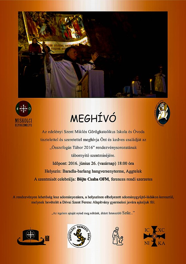 A 2016-os Összefogás Tábor különleges misével kezdődik, hiszen azt a Baradla-barlang Hangversenytermében fogja celebrálni Böjte Csaba OFM, ferences rendi szerzetes. A meghívott vendégek között ott lesz Kocsis Fülöp érsek-metropolita is