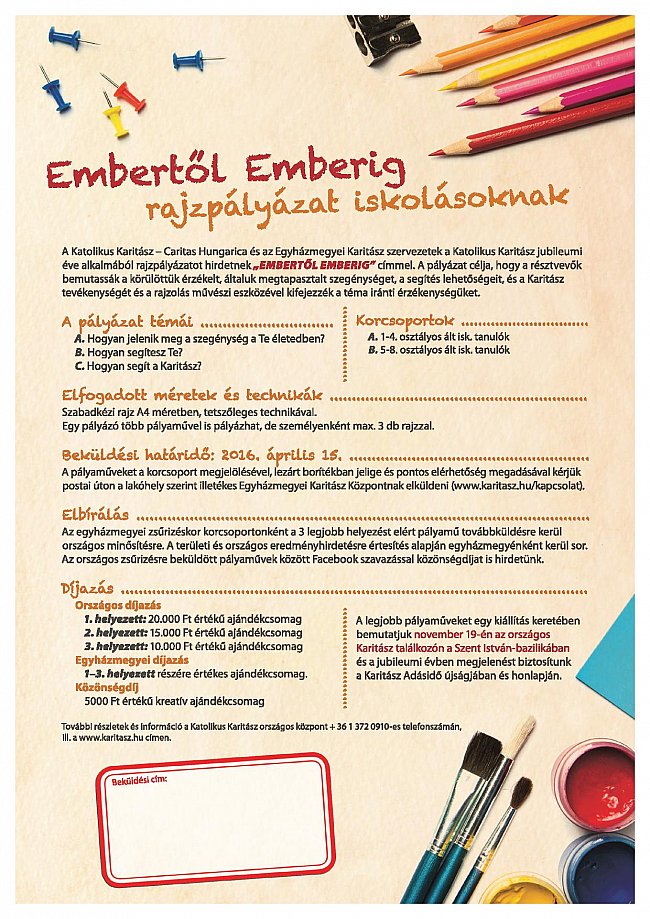 A Katolikus Karitász – Caritas Hungarica és az Egyházmegyei Karitász szervezetek a Katolikus Karitász jubileumi éve alkalmából rajzpályázatot hirdetnek „EMBERTŐL EMBERIG” címmel.