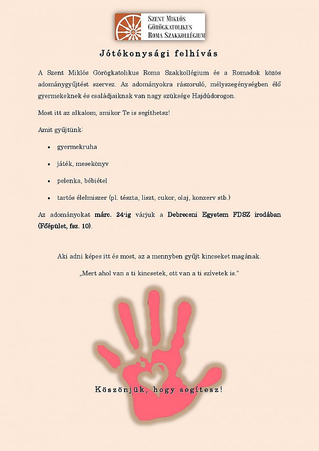 A Szent Miklós Görögkatolikus Roma Szakkollégium és a Romadok közös adománygyűjtést szervez. Az adományokra rászoruló, mélyszegénységben élő gyermekeknek és családjaiknak nagy szüksége van Hajdúdorogon.
