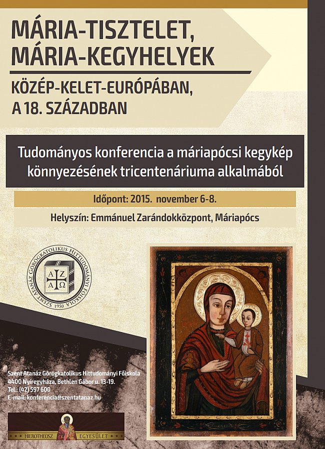 A Görögkatolikus Metropólia és a Szent Atanáz Görögkatolikus Hittudományi Főiskola tudományos konferenciát szervez a máriapócsi kegykép könnyezésének tricentenáriuma alkalmából Mária-tisztelet, Mária-kegyhelyek Közép-Kelet-Európában a 18. században címmel Máriapócson, az Emmánuel Zarándokközpontban 2015. november 6-7-én.