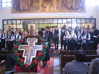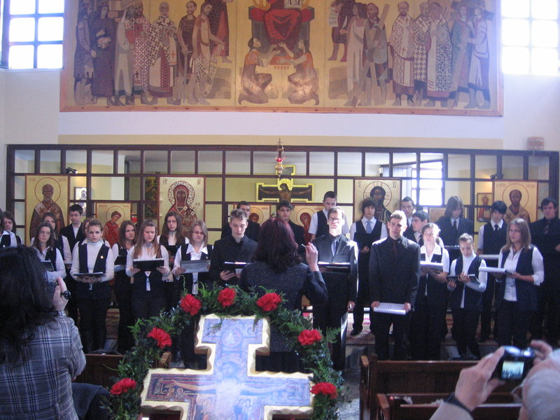 A liturgia végén még bizánci énekeinkből kaptunk egy csokrot, amely szépen megkoronázta a délelőttöt. Lelkünkben hála fakadt az Isten iránt, hogy van görögkatolikus gimnáziumunk, ahol kincseinket szeretik, ápolják, s az ott tanulók a továbbadás szándékával növekednek testben és lélekben egyaránt. Az énekkar látogatása agapéval ért véget.