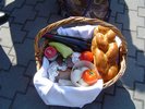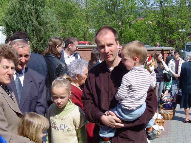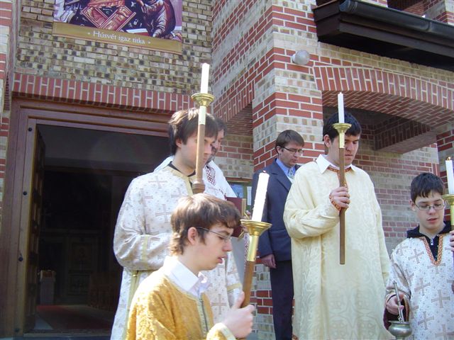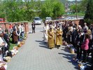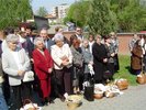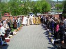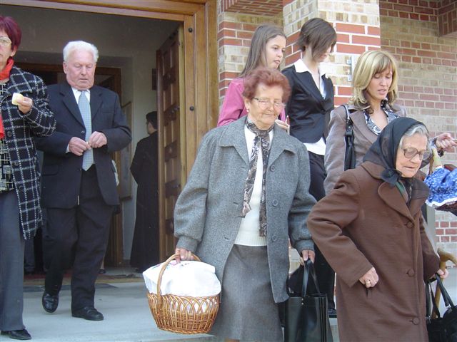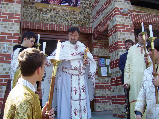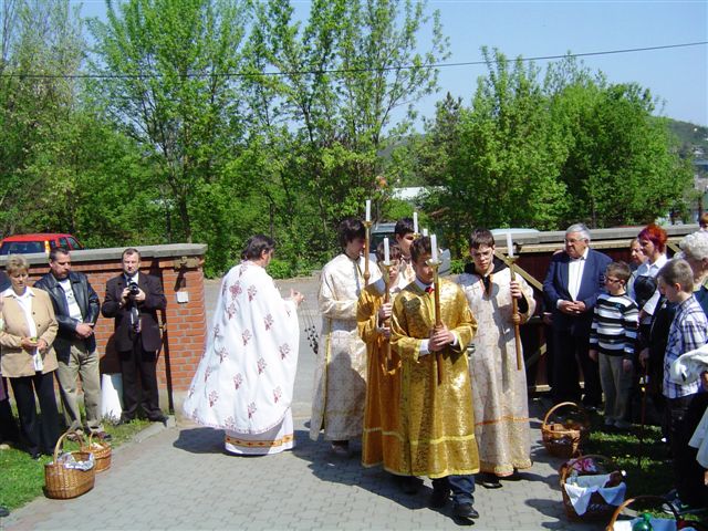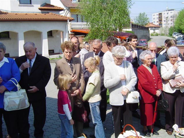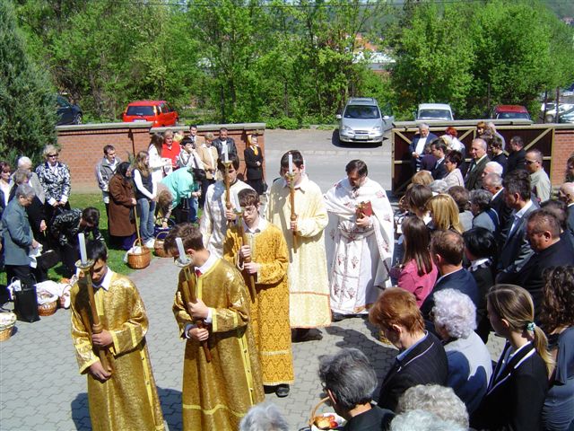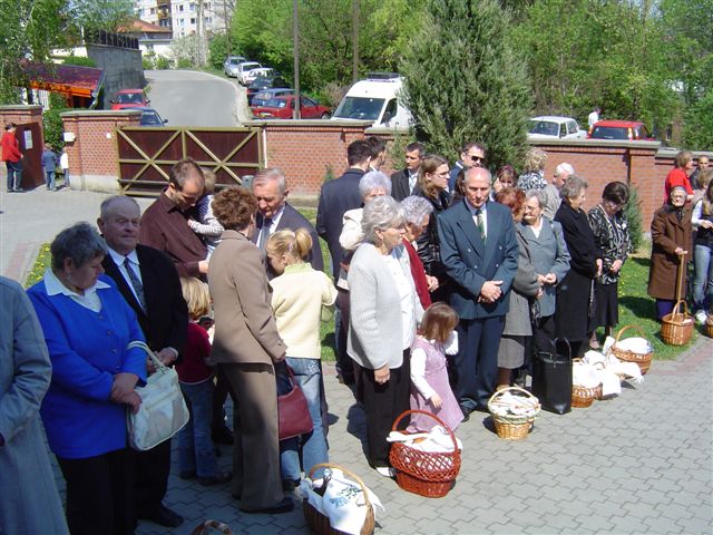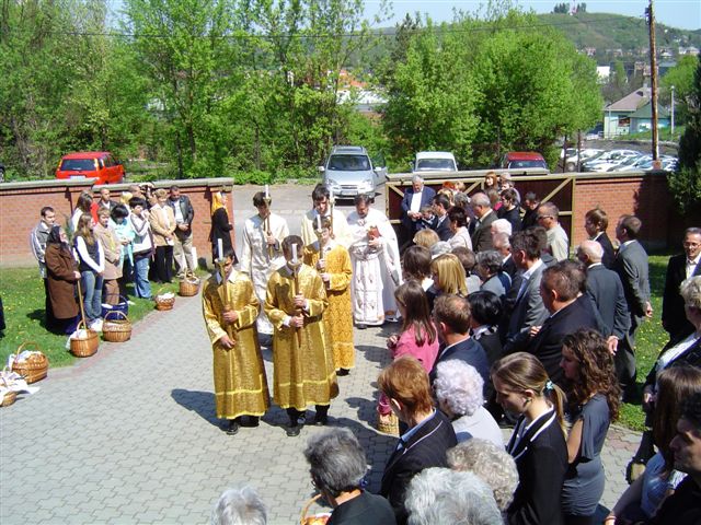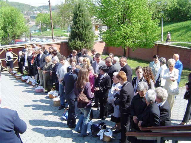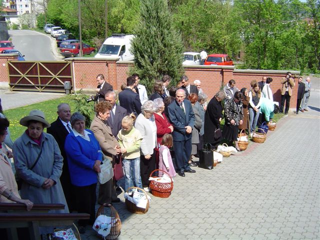 A Szent Liturgiát követően a kosarak tartalmát dr. Kaulics László parókus szentelte meg a tempolom udvarán ragyogó napsütésben.