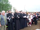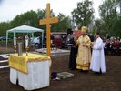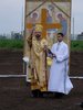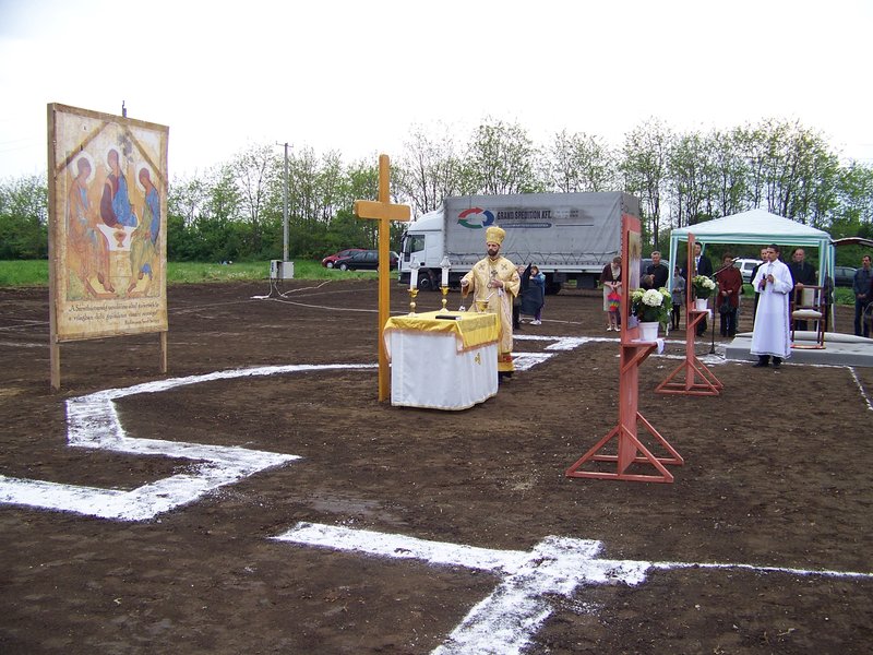 Az alapkőletételnél már állnak a falak. Igaz még csak az alaprajzot festették fel, de az épülő falak már most stabil alapon nyugszanak: a hívek összetartásán, szeretetén, áldozatkészségén. Hátul, a szentélyrésznél Rubljov Szentháromság ikonját feszítették ki. A család szimbóluma. A templomot is a Szentháromság tiszteletére fogják felszentelni. Arra gondolok, mennyire jó választás volt – az örökösföldi egyházközségben egy család lakozik. Egy család lakozik, mely otthon épít magának.