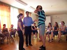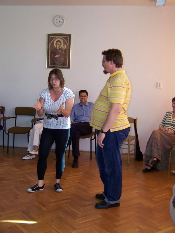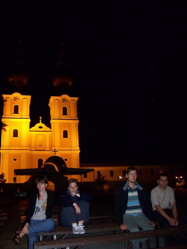 A lelki töltekezést – a testi töltekezés után – Makkai atyával folytattuk. Eközben megszemélyesíthettük a Kánai menyegző szereplőit, később szituációs gyakorlatokban élhettük bele magunkat egy-egy helyzetbe, mely olykor édes, olykor keserédes volt. Az este „komoly” részét a Bazilika előtti téren gitárral kísért énekléssel fejeztük be. Az éneklés közben, ha csak egy rövid ideig is, de csatlakozott hozzánk Fülöp püspök atya. Sajnos ezt most nem testi valójában tette, hanem telefonon „üzent” nekünk. Köszönjük, hogy gondolt ránk!