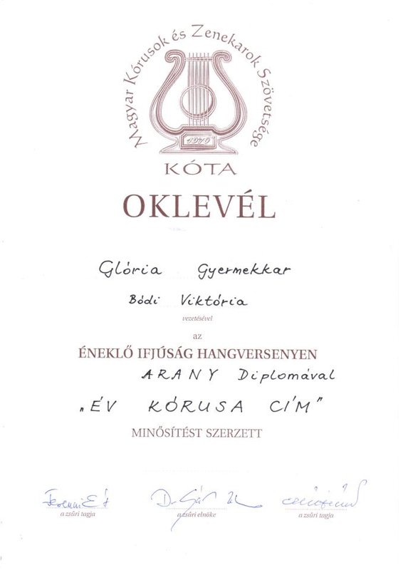 - A Glória Gyermekkar pedig (6.-9. osztályos tanulók) arany minősítést diplomával és az „Év kórusa” címet, amellyel lehetőséget kaptak az országos kórustalálkozón való részvételre. Karvezető: Bódi Viktória.